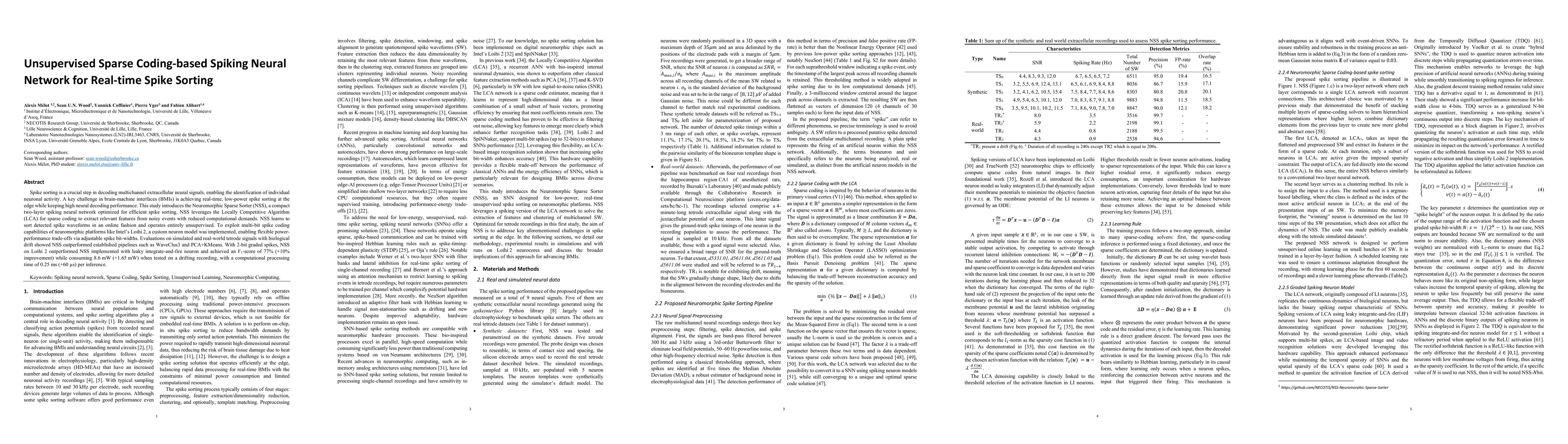 The research introduces Neuromorphic Sparse Sorter (NSS), a compact unsupervised spiking neural network for real-time, low-power spike sorting. It outperforms traditional methods like WaveClus3 and PCA+KMeans, achieving an F1-score of 77% on Intel's Loihi 2 neuromorphic platform, with improved performance and slightly higher power consumption.
