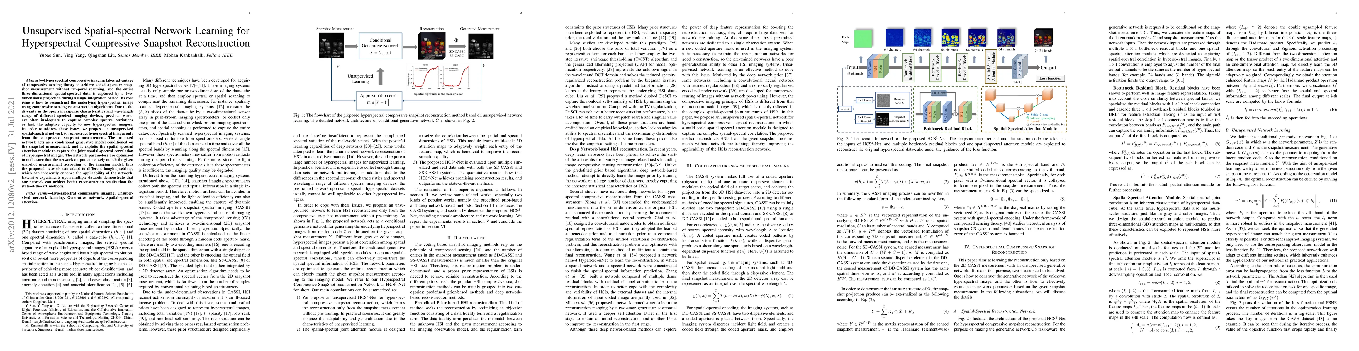 This paper proposes an unsupervised spatial-spectral network for reconstructing hyperspectral images from compressive snapshot measurements, leveraging a spatial-spectral attention module to capture joint correlations. The network adapts to different imaging settings and outperforms state-of-the-art methods in extensive experiments.