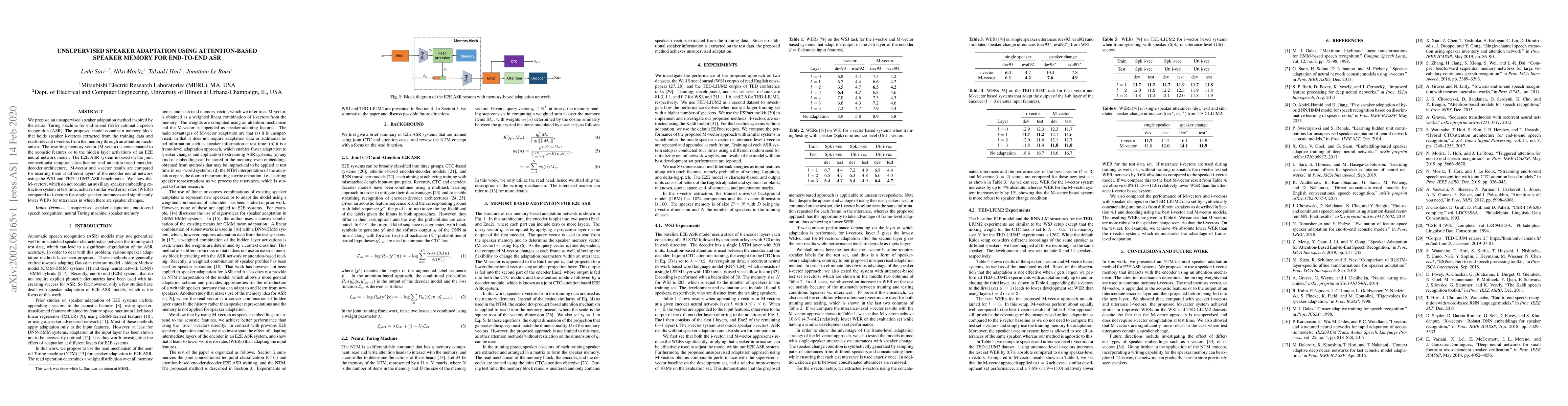 We propose an unsupervised speaker adaptation method inspired by the neural Turing machine for end-to-end (E2E) automatic speech recognition (ASR). The proposed model contains a memory block that holds speaker i-vectors extracted from the training data and reads relevant i-vectors from the memory through an attention mechanism. The resulting memory vector (M-vector) is concatenated to the acoustic features or to the hidden layer activations of an E2E neural network model. The E2E ASR system is based on the joint connectionist temporal classification and attention-based encoder-decoder architecture. M-vector and i-vector results are compared for inserting them at different layers of the encoder neural network using the WSJ and TED-LIUM2 ASR benchmarks. We show that M-vectors, which do not require an auxiliary speaker embedding extraction system at test time, achieve similar word error rates (WERs) compared to i-vectors for single speaker utterances and significantly lower WERs for utterances in which there are speaker changes.