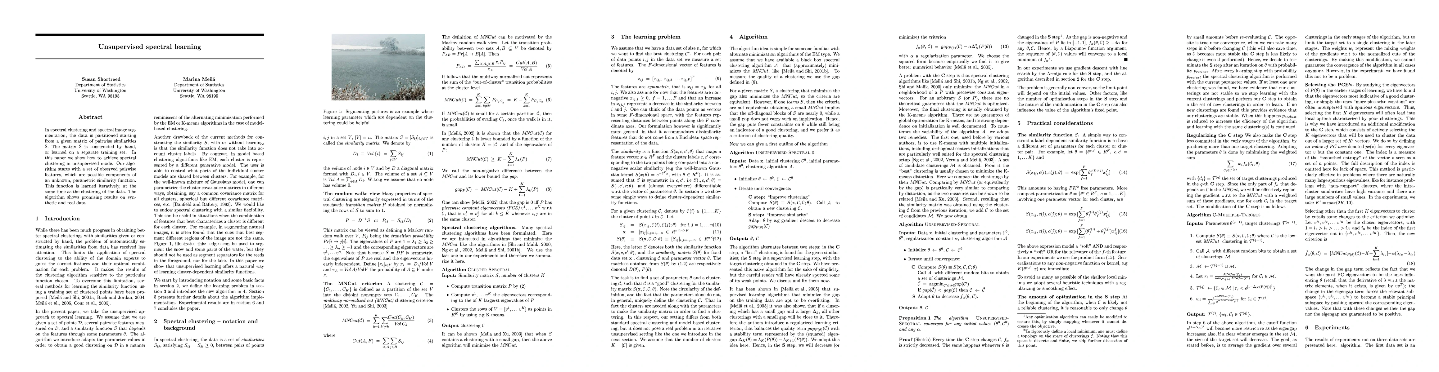 This paper presents an unsupervised spectral clustering algorithm that iteratively learns an unknown similarity function from observed pairwise features, achieving clustering without a pre-constructed similarity matrix, and demonstrates its effectiveness on both synthetic and real datasets.