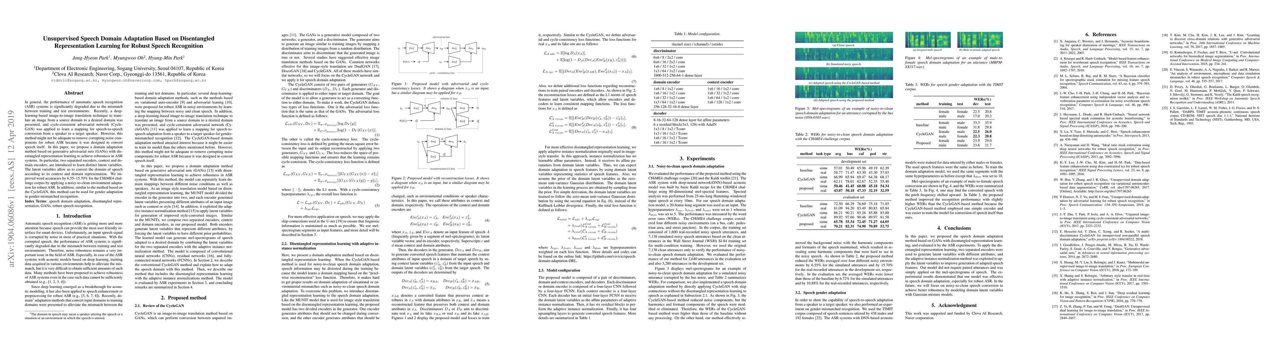 In general, the performance of automatic speech recognition (ASR) systems is significantly degraded due to the mismatch between training and test environments. Recently, a deep-learning-based image-to-image translation technique to translate an image from a source domain to a desired domain was presented, and cycle-consistent adversarial network (CycleGAN) was applied to learn a mapping for speech-to-speech conversion from a speaker to a target speaker. However, this method might not be adequate to remove corrupting noise components for robust ASR because it was designed to convert speech itself. In this paper, we propose a domain adaptation method based on generative adversarial nets (GANs) with disentangled representation learning to achieve robustness in ASR systems. In particular, two separated encoders, context and domain encoders, are introduced to learn distinct latent variables. The latent variables allow us to convert the domain of speech according to its context and domain representation. We improved word accuracies by 6.55~15.70\% for the CHiME4 challenge corpus by applying a noisy-to-clean environment adaptation for robust ASR. In addition, similar to the method based on the CycleGAN, this method can be used for gender adaptation in gender-mismatched recognition.