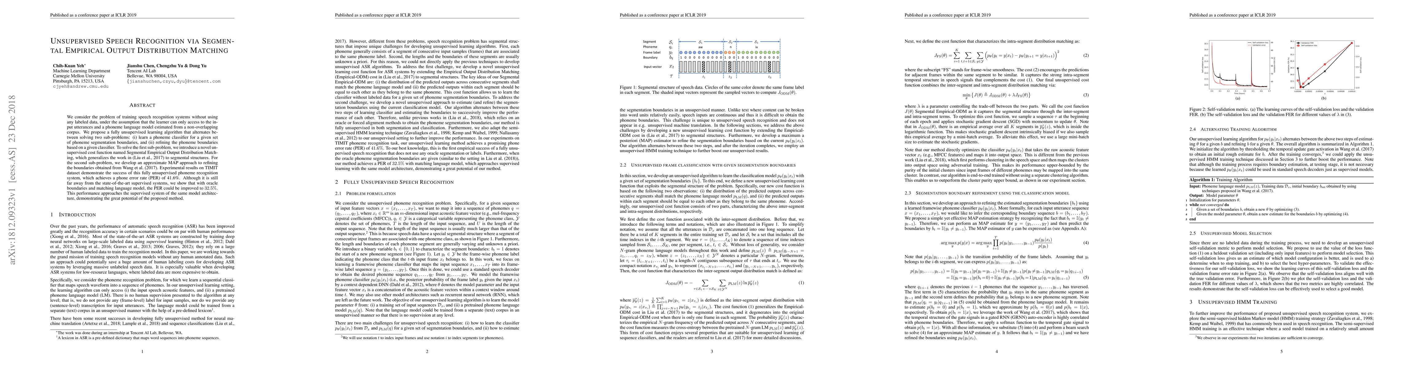This paper proposes a fully unsupervised speech recognition algorithm that alternates between learning a phoneme classifier and refining phoneme segmentation boundaries using a novel Segmental Empirical Output Distribution Matching cost function. Experimental results on the TIMIT dataset show a phone error rate of 41.6%, demonstrating the potential of the method despite its distance from supervised systems.