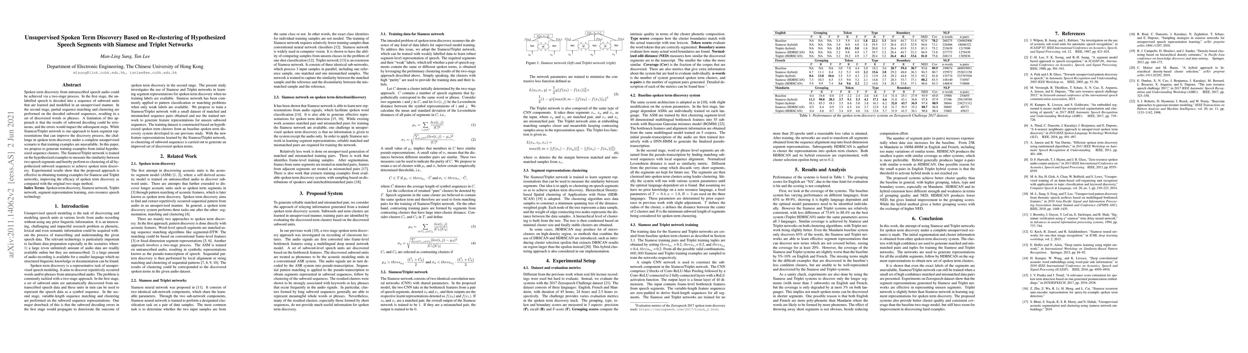 This paper proposes an unsupervised method for spoken term discovery using Siamese and Triplet networks, which re-clusters hypothesized speech segments generated from an initial two-stage process. The approach generates training examples from these clusters, improving the efficacy of term discovery compared to the original method.