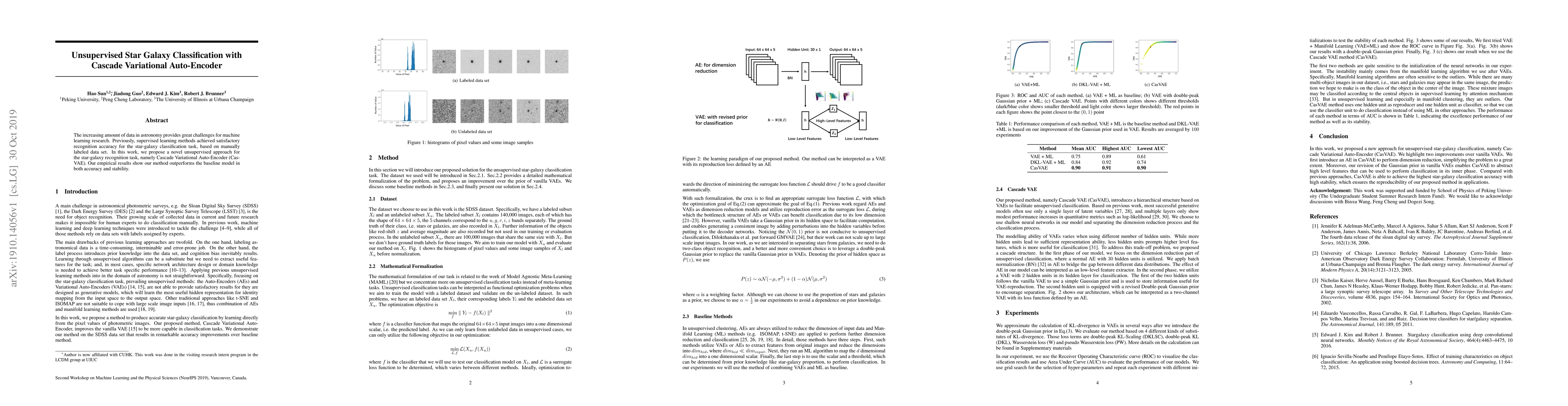 This paper introduces an unsupervised method, Cascade Variational Auto-Encoder (CasVAE), for classifying stars and galaxies without relying on manually labeled data. The proposed method outperforms baseline models in both accuracy and stability.