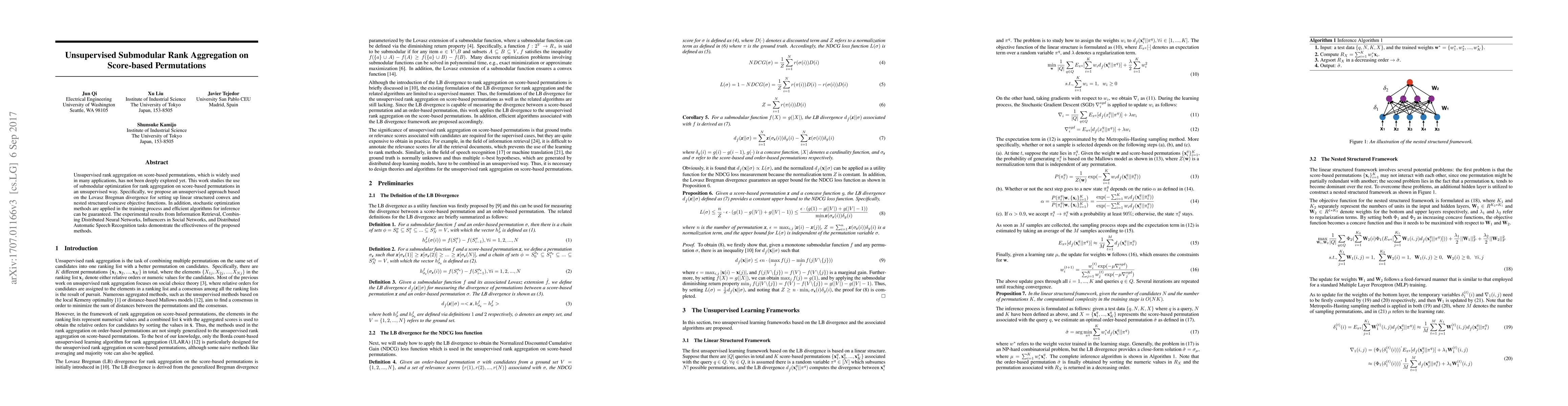This paper proposes an unsupervised submodular rank aggregation method for score-based permutations using Lovasz Bregman divergence, with linear and nested concave objective functions. Experimental results across various applications show the effectiveness of the proposed method.