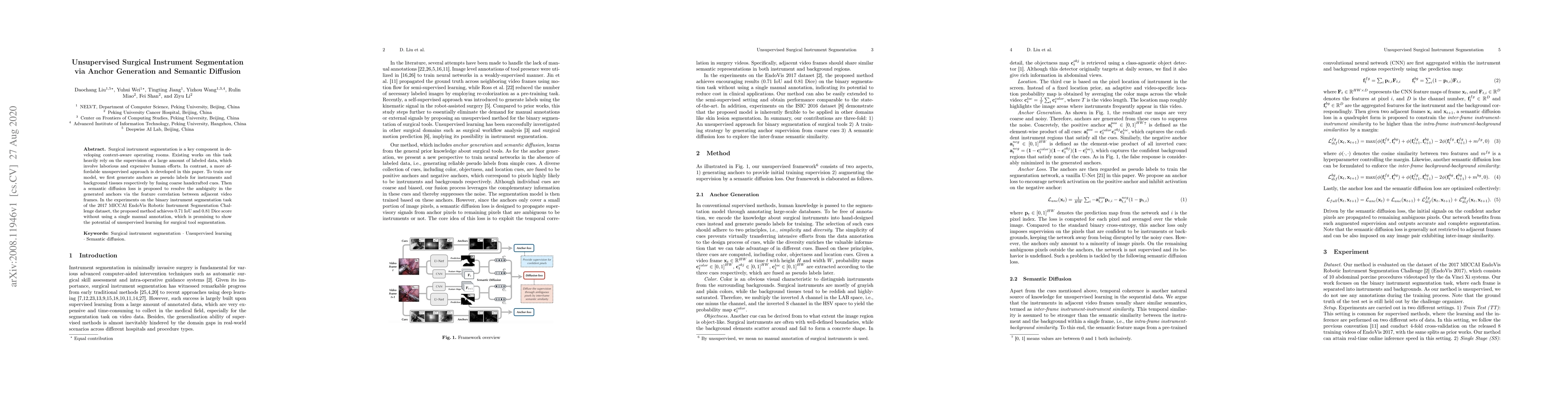 This paper presents an unsupervised method for surgical instrument segmentation using anchor generation and semantic diffusion. The approach generates pseudo labels for instruments and background tissues, then employs a semantic diffusion loss to refine these labels, achieving 0.71 IoU and 0.81 Dice score without manual annotations, demonstrating the potential of unsupervised learning for surgical tool segmentation.