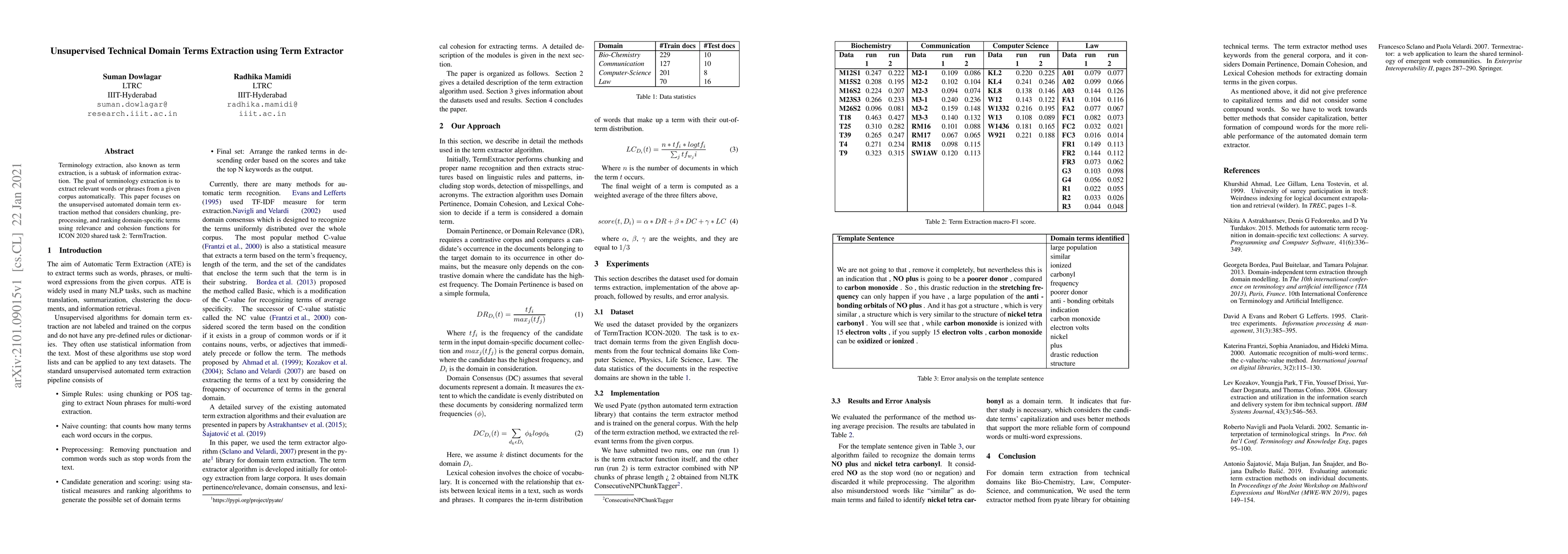 This paper presents an unsupervised method for extracting technical domain terms using Term Extractor, which involves chunking, preprocessing, and ranking terms based on relevance and cohesion for the ICON 2020 TermTraction task. The approach aims to automatically identify relevant words or phrases from a corpus without human intervention.