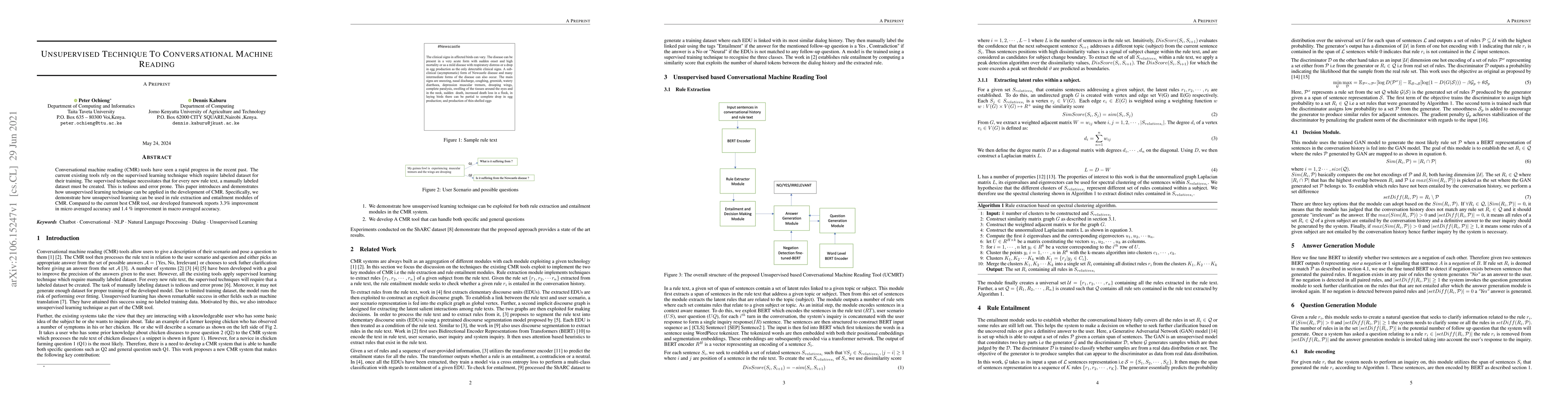 Conversational machine reading (CMR) tools have seen a rapid progress in the recent past. The current existing tools rely on the supervised learning technique which require labeled dataset for their training. The supervised technique necessitates that for every new rule text, a manually labeled dataset must be created. This is tedious and error prone. This paper introduces and demonstrates how unsupervised learning technique can be applied in the development of CMR. Specifically, we demonstrate how unsupervised learning can be used in rule extraction and entailment modules of CMR. Compared to the current best CMR tool, our developed framework reports 3.3% improvement in micro averaged accuracy and 1.4 % improvement in macro averaged accuracy.
