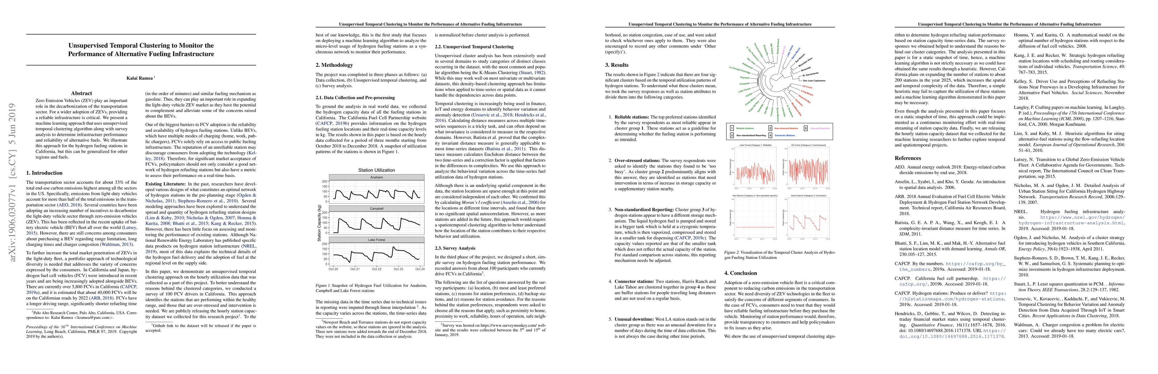 This paper explores a machine learning method using unsupervised temporal clustering to assess the performance and reliability of alternative fueling infrastructure, specifically for hydrogen stations in California. The approach combines clustering with survey analysis, offering a scalable solution for monitoring zero emission vehicle infrastructure.
