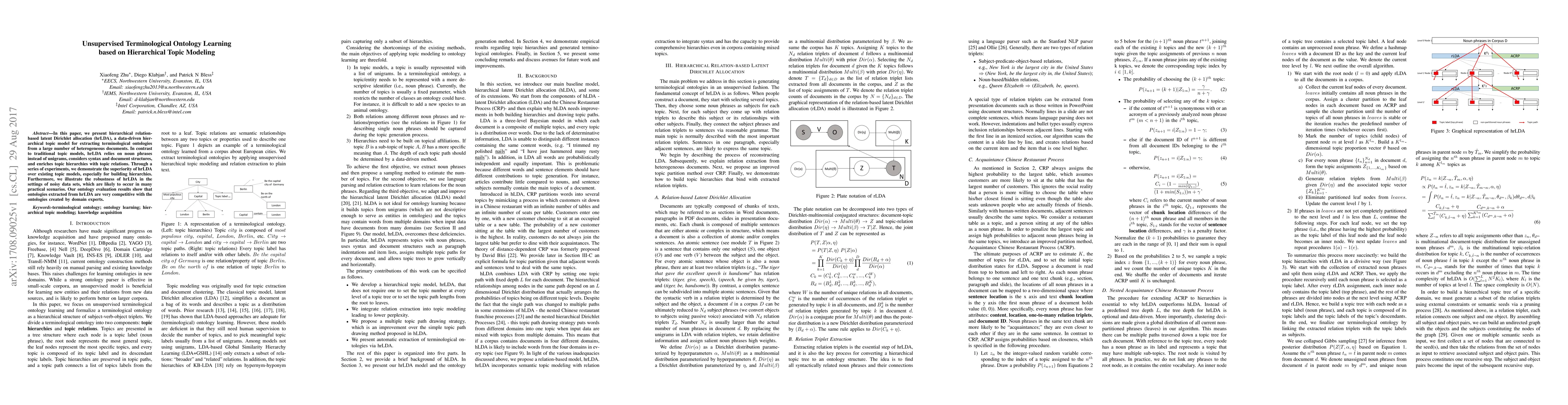 This paper introduces hrLDA, a hierarchical topic model that extracts terminological ontologies from heterogeneous documents using noun phrases and considers syntax and document structures. Experiments show hrLDA's superior performance over traditional models, especially in building hierarchical structures, and its robustness in noisy data scenarios, rivaling expert-created ontologies.