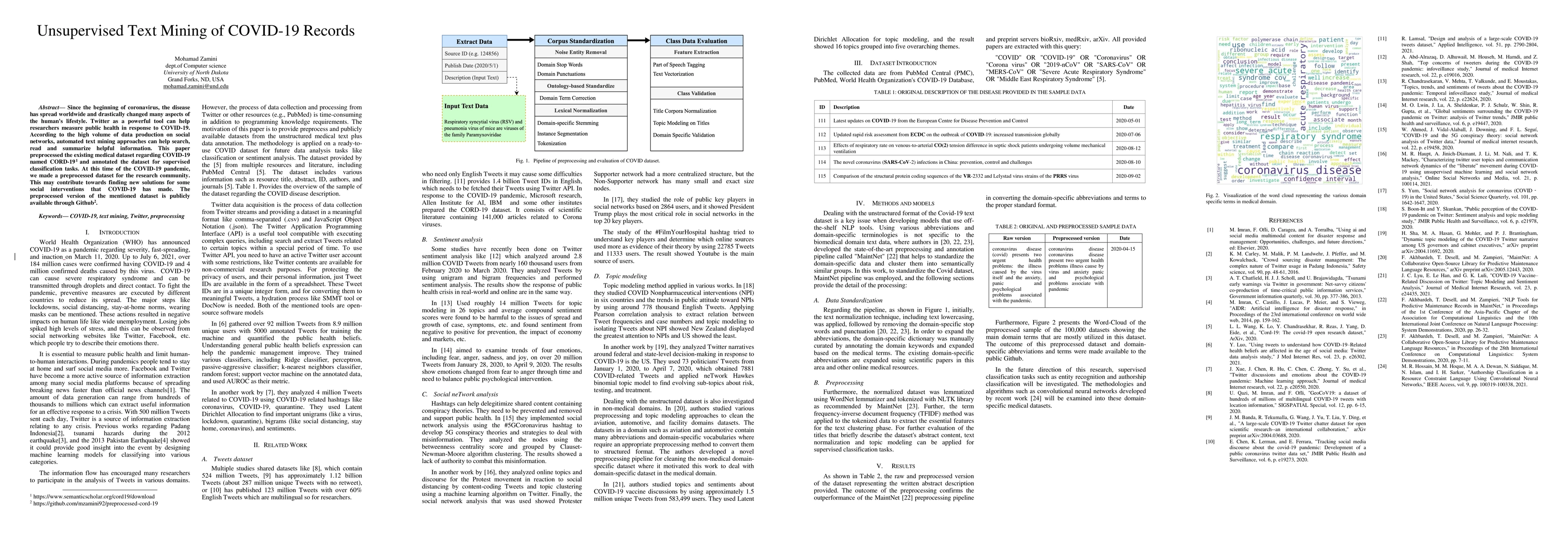 This paper presents an unsupervised text mining approach to analyze COVID-19 records from the CORD-19 dataset, aiming to extract useful information from the high volume of data on social networks. The preprocessed dataset is publicly available to support research on social interventions during the pandemic.