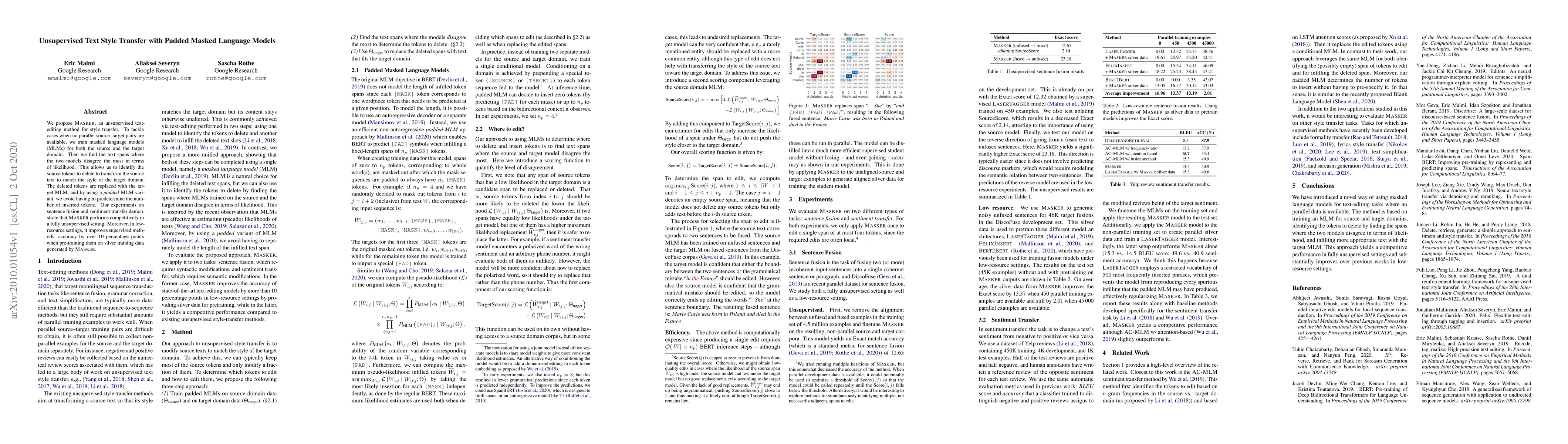 We propose Masker, an unsupervised text-editing method for style transfer. To tackle cases when no parallel source-target pairs are available, we train masked language models (MLMs) for both the source and the target domain. Then we find the text spans where the two models disagree the most in terms of likelihood. This allows us to identify the source tokens to delete to transform the source text to match the style of the target domain. The deleted tokens are replaced with the target MLM, and by using a padded MLM variant, we avoid having to predetermine the number of inserted tokens. Our experiments on sentence fusion and sentiment transfer demonstrate that Masker performs competitively in a fully unsupervised setting. Moreover, in low-resource settings, it improves supervised methods' accuracy by over 10 percentage points when pre-training them on silver training data generated by Masker.