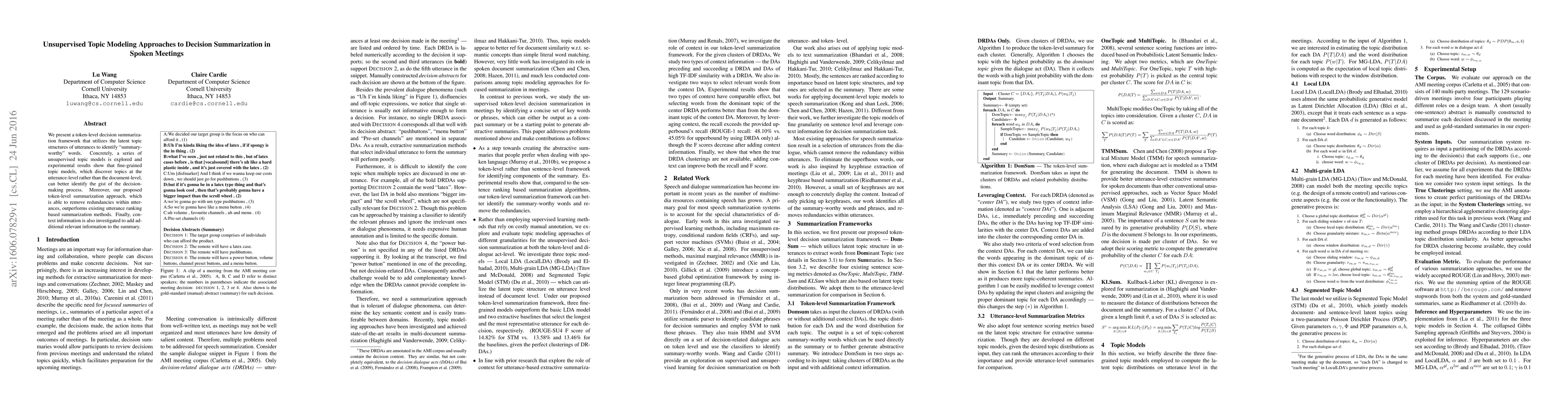 This paper proposes an unsupervised topic modeling framework for summarizing decisions in spoken meetings by identifying "summary-worthy" words through latent topic structures. Fine-grained, utterance-level topic models are shown to better capture the essence of the decision-making process compared to document-level models, and the token-level summarization approach outperforms existing methods by removing redundancies.
