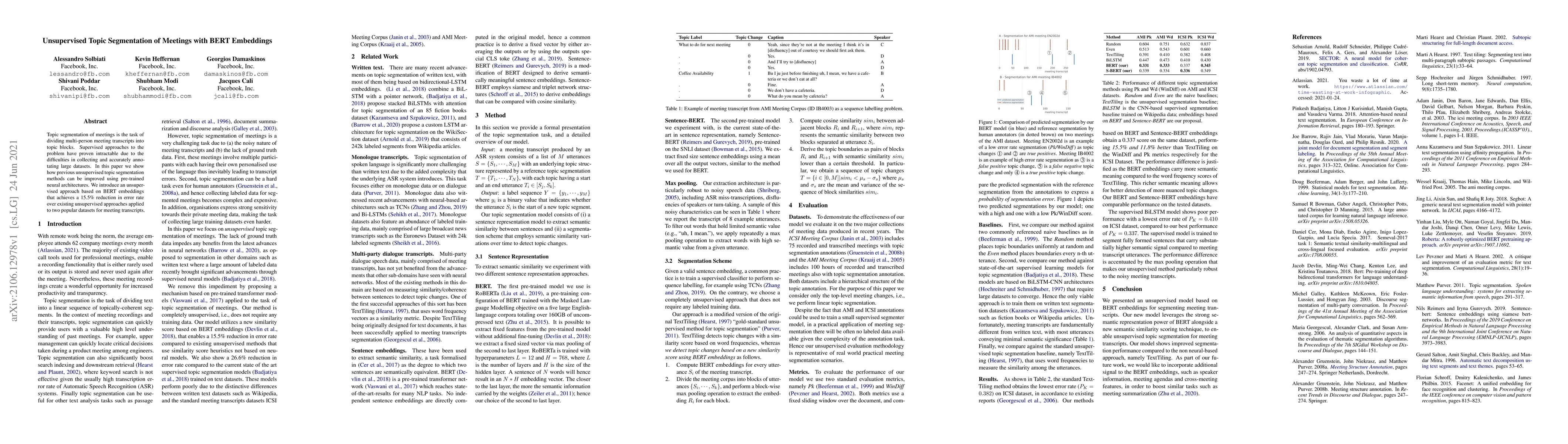 This paper presents an unsupervised method for topic segmentation in meeting transcripts using BERT embeddings, achieving a 15.5% reduction in error compared to existing unsupervised techniques, addressing the challenge of data annotation in supervised approaches.