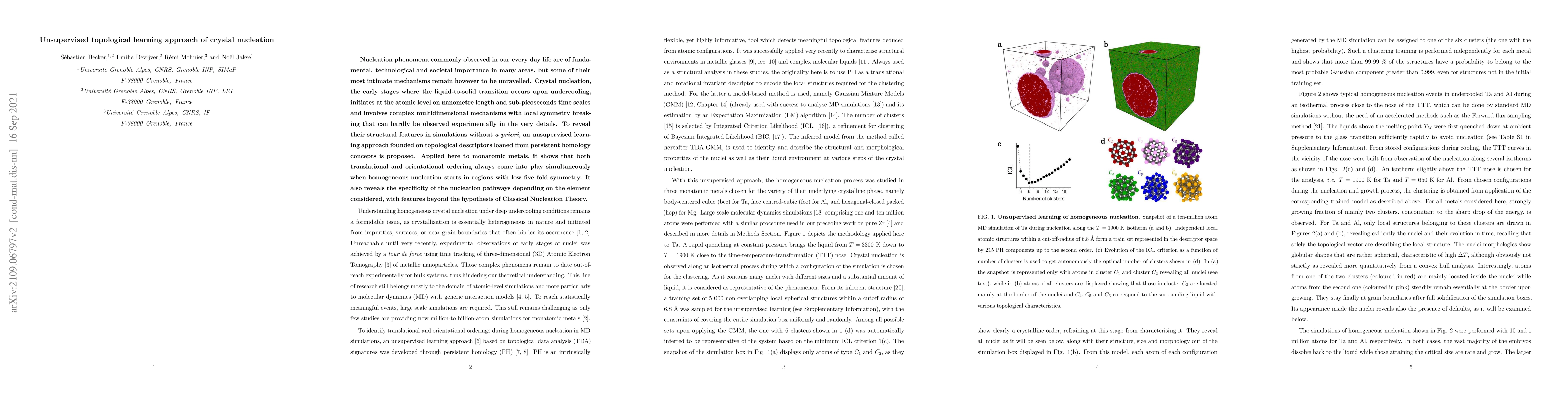 Nucleation phenomena commonly observed in our every day life are of fundamental, technological and societal importance in many areas, but some of their most intimate mechanisms remain however to be unravelled. Crystal nucleation, the early stages where the liquid-to-solid transition occurs upon undercooling, initiates at the atomic level on nanometre length and sub-picoseconds time scales and involves complex multidimensional mechanisms with local symmetry breaking that can hardly be observed experimentally in the very details. To reveal their structural features in simulations without a priori, an unsupervised learning approach founded on topological descriptors loaned from persistent homology concepts is proposed. Applied here to monatomic metals, it shows that both translational and orientational ordering always come into play simultaneously when homogeneous nucleation starts in regions with low five-fold symmetry. It also reveals the specificity of the nucleation pathways depending on the element considered, with features beyond the hypothesis of Classical Nucleation Theory.
