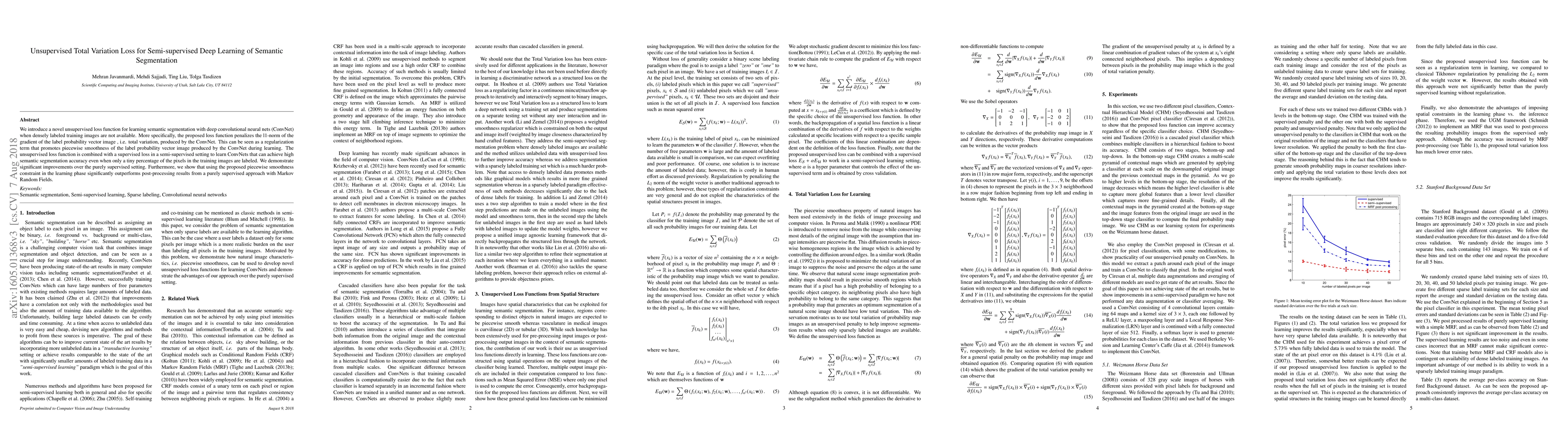 We introduce a novel unsupervised loss function for learning semantic segmentation with deep convolutional neural nets (ConvNet) when densely labeled training images are not available. More specifically, the proposed loss function penalizes the L1-norm of the gradient of the label probability vector image , i.e. total variation, produced by the ConvNet. This can be seen as a regularization term that promotes piecewise smoothness of the label probability vector image produced by the ConvNet during learning. The unsupervised loss function is combined with a supervised loss in a semi-supervised setting to learn ConvNets that can achieve high semantic segmentation accuracy even when only a tiny percentage of the pixels in the training images are labeled. We demonstrate significant improvements over the purely supervised setting in the Weizmann horse, Stanford background and Sift Flow datasets. Furthermore, we show that using the proposed piecewise smoothness constraint in the learning phase significantly outperforms post-processing results from a purely supervised approach with Markov Random Fields (MRF). Finally, we note that the framework we introduce is general and can be used to learn to label other types of structures such as curvilinear structures by modifying the unsupervised loss function accordingly.