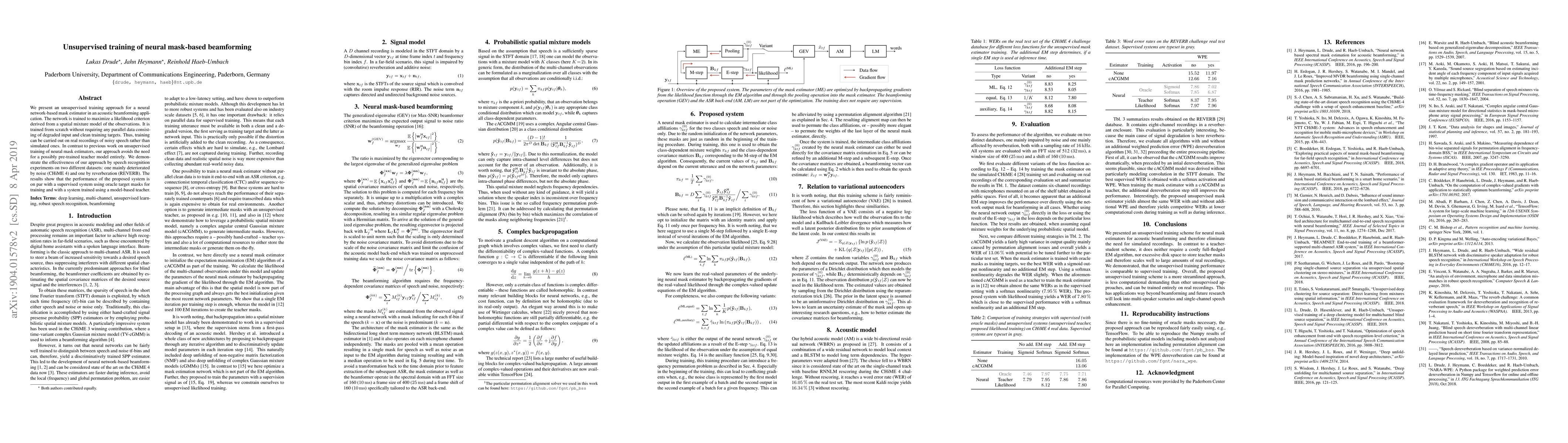 This paper introduces an unsupervised training method for neural network-based mask estimators in acoustic beamforming, eliminating the need for parallel data or pre-trained teacher models. The approach is demonstrated to perform competitively in speech recognition tasks on noisy and reverberant datasets.