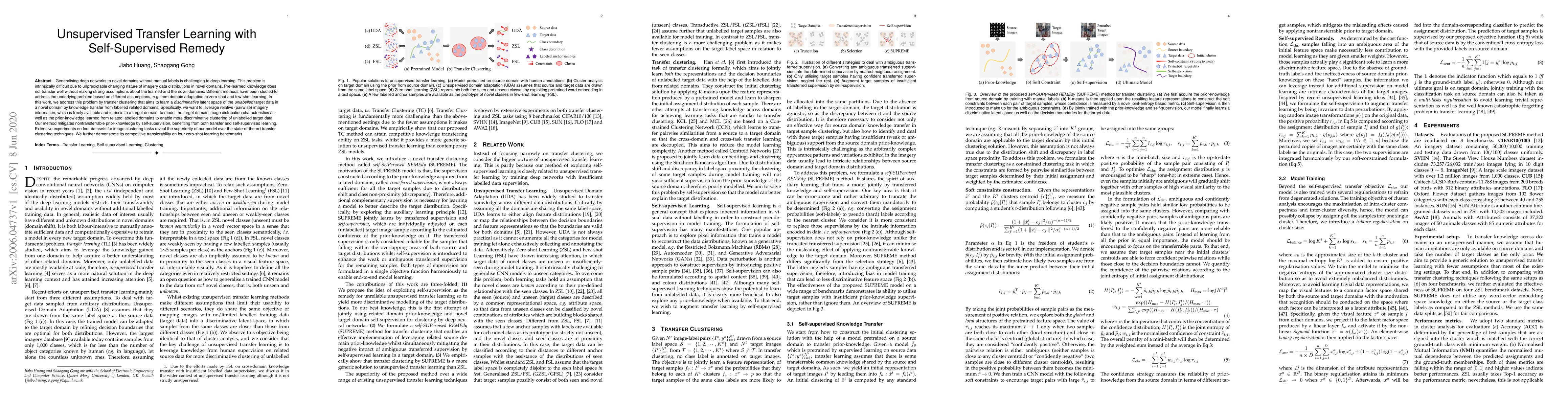 Generalising deep networks to novel domains without manual labels is challenging to deep learning. This problem is intrinsically difficult due to unpredictable changing nature of imagery data distributions in novel domains. Pre-learned knowledge does not transfer well without making strong assumptions about the learned and the novel domains. Different methods have been studied to address the underlying problem based on different assumptions, e.g. from domain adaptation to zero-shot and few-shot learning. In this work, we address this problem by transfer clustering that aims to learn a discriminative latent space of the unlabelled target data in a novel domain by knowledge transfer from labelled related domains. Specifically, we want to leverage relative (pairwise) imagery information, which is freely available and intrinsic to a target domain, to model the target domain image distribution characteristics as well as the prior-knowledge learned from related labelled domains to enable more discriminative clustering of unlabelled target data. Our method mitigates nontransferrable prior-knowledge by self-supervision, benefiting from both transfer and self-supervised learning. Extensive experiments on four datasets for image clustering tasks reveal the superiority of our model over the state-of-the-art transfer clustering techniques. We further demonstrate its competitive transferability on four zero-shot learning benchmarks.