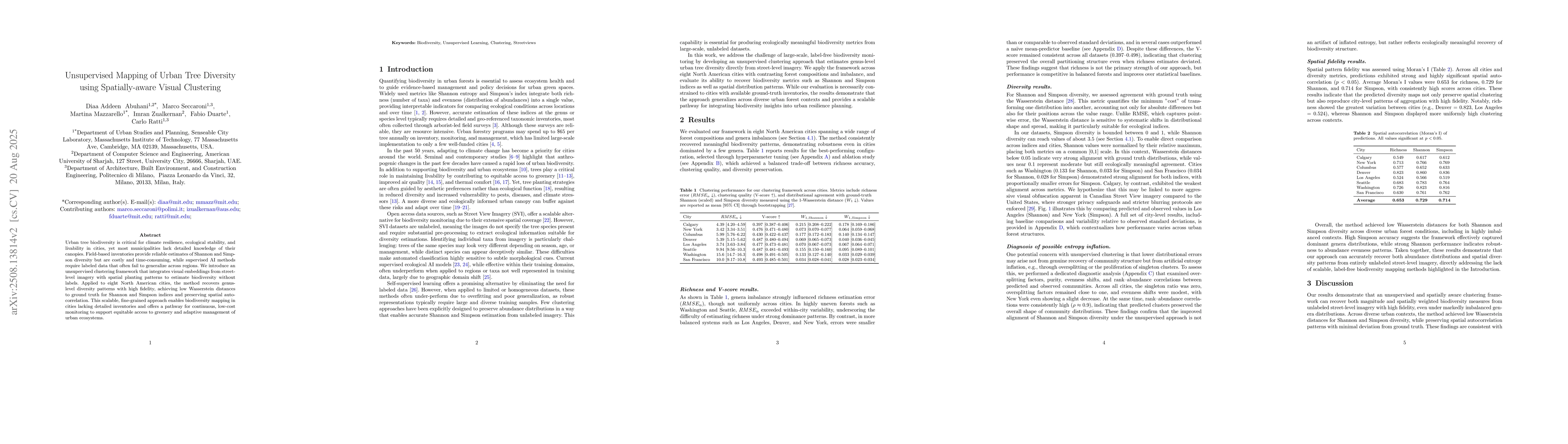 An unsupervised clustering framework for estimating urban tree biodiversity using spatially-aware visual clustering from street-level imagery.