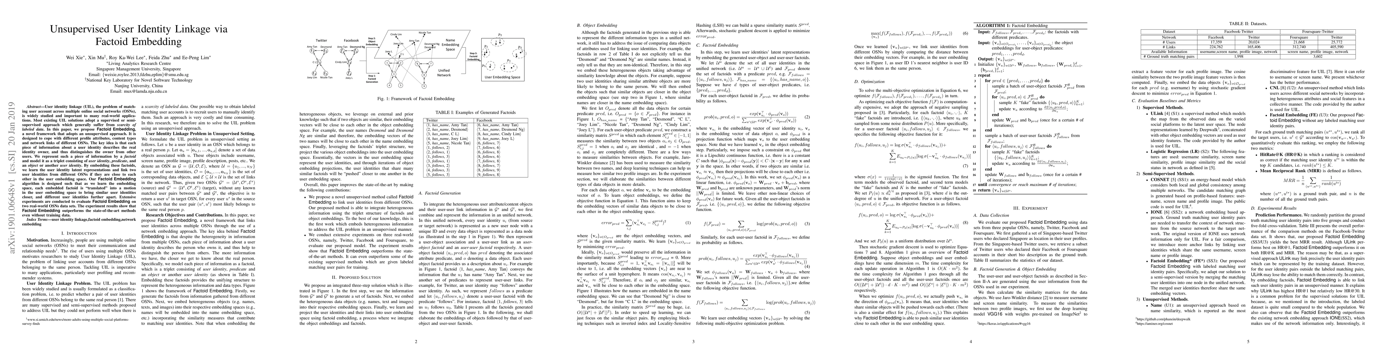 This paper proposes Factoid Embedding, an unsupervised framework for user identity linkage across multiple online social networks, which models user information as factoid triplets and learns latent representations to link identities without labeled data, outperforming existing methods in experiments.
