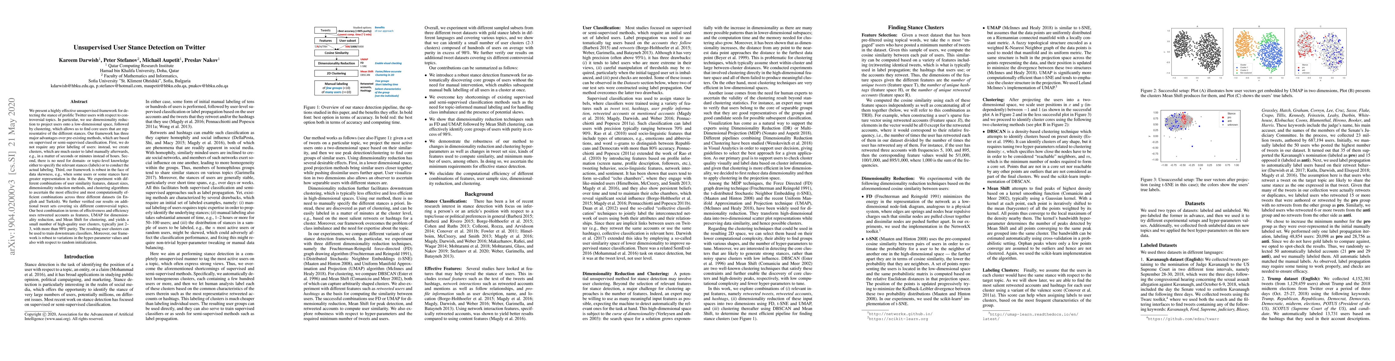 We present a highly effective unsupervised framework for detecting the stance of prolific Twitter users with respect to controversial topics. In particular, we use dimensionality reduction to project users onto a low-dimensional space, followed by clustering, which allows us to find core users that are representative of the different stances. Our framework has three major advantages over pre-existing methods, which are based on supervised or semi-supervised classification. First, we do not require any prior labeling of users: instead, we create clusters, which are much easier to label manually afterwards, e.g., in a matter of seconds or minutes instead of hours. Second, there is no need for domain- or topic-level knowledge either to specify the relevant stances (labels) or to conduct the actual labeling. Third, our framework is robust in the face of data skewness, e.g., when some users or some stances have greater representation in the data. We experiment with different combinations of user similarity features, dataset sizes, dimensionality reduction methods, and clustering algorithms to ascertain the most effective and most computationally efficient combinations across three different datasets (in English and Turkish). We further verified our results on additional tweet sets covering six different controversial topics. Our best combination in terms of effectiveness and efficiency uses retweeted accounts as features, UMAP for dimensionality reduction, and Mean Shift for clustering, and yields a small number of high-quality user clusters, typically just 2--3, with more than 98\% purity. The resulting user clusters can be used to train downstream classifiers. Moreover, our framework is robust to variations in the hyper-parameter values and also with respect to random initialization.