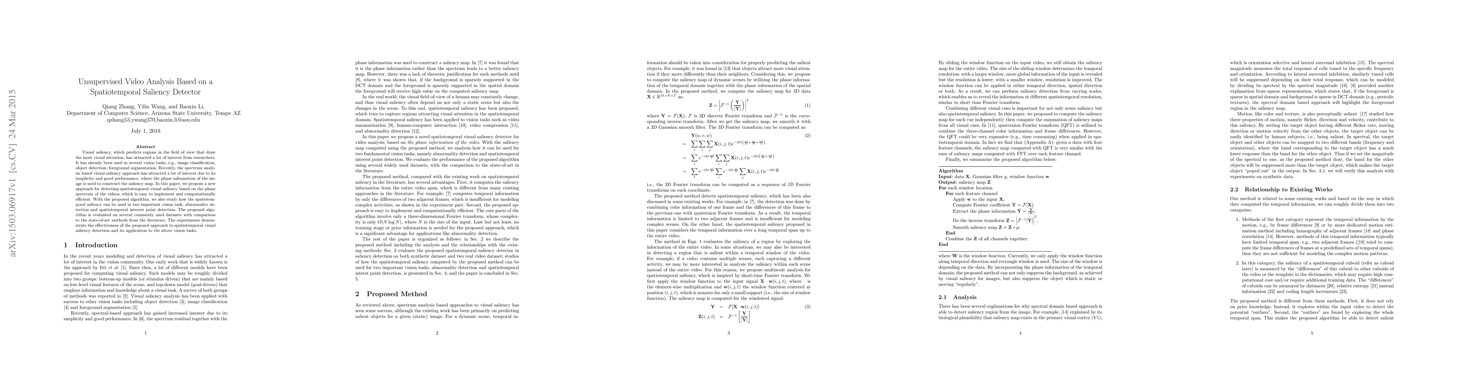 This paper introduces a novel spatiotemporal saliency detection method based on the phase spectrum of video frames, demonstrating its efficiency and application in abnormality detection and spatiotemporal interest point detection. The proposed algorithm is shown to outperform state-of-the-art methods through evaluations on standard datasets.
