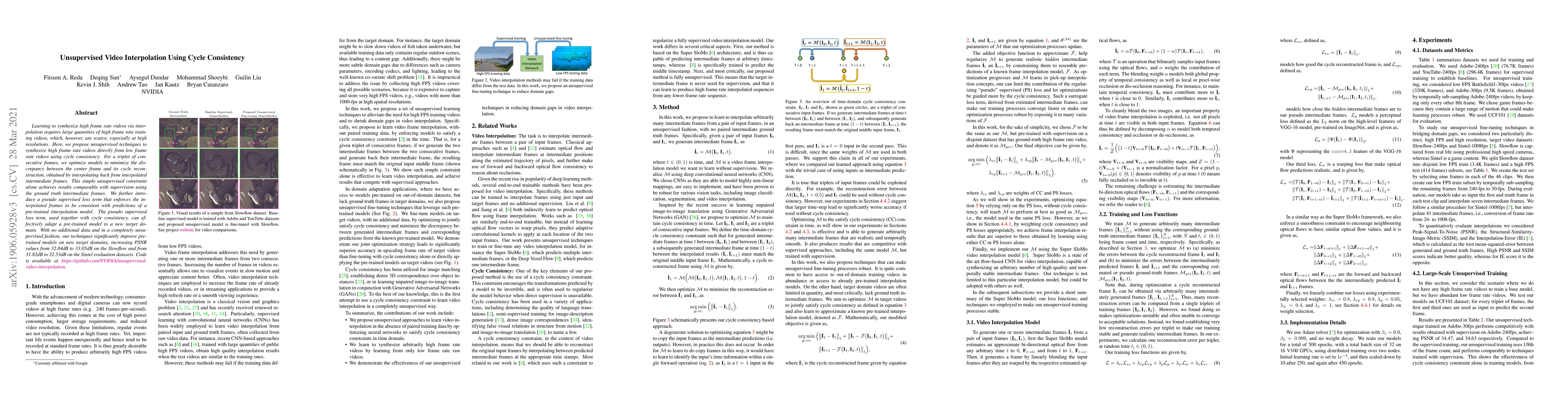 This paper proposes unsupervised techniques for synthesizing high frame rate videos from low frame rate inputs using cycle consistency. The method achieves results comparable to supervised methods without ground truth data, and further improves performance with a pseudo supervised loss term, significantly enhancing model adaptation to new domains.