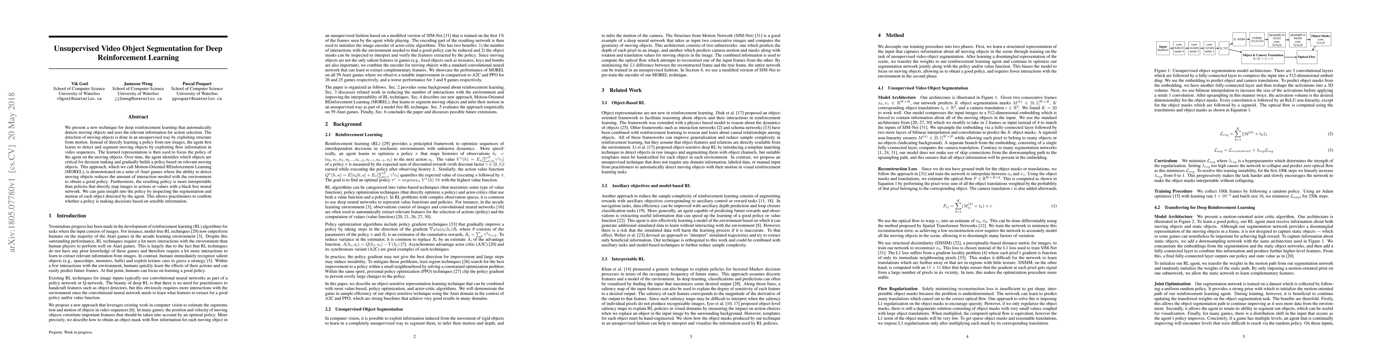 This paper introduces MOREL, an unsupervised technique for deep reinforcement learning that detects and segments moving objects in video sequences to inform policy decisions, reducing interaction with the environment and enhancing policy interpretability through object segmentation and motion analysis.