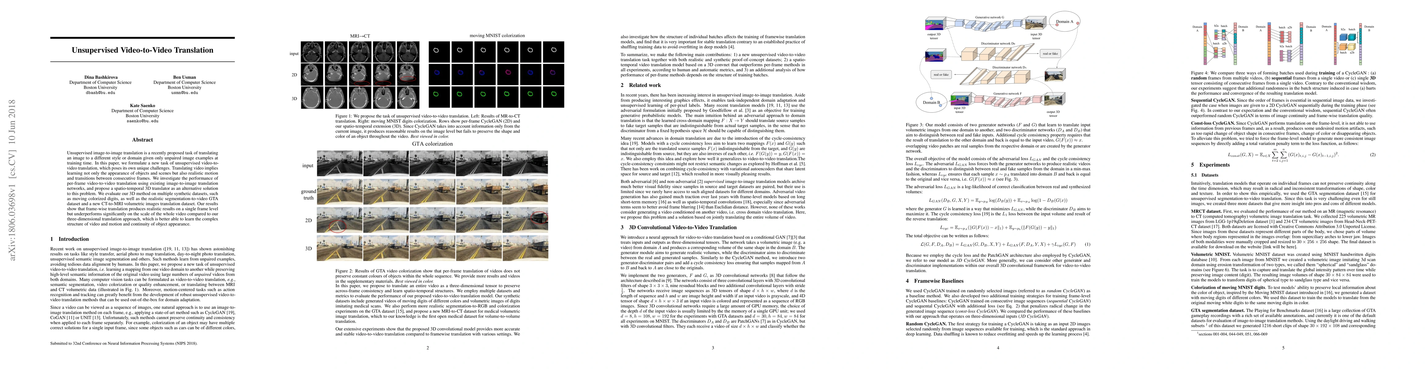 This paper introduces the task of unsupervised video-to-video translation, addressing the challenge of translating videos while preserving realistic motion and transitions. It compares per-frame translation methods with a proposed spatio-temporal 3D translator, demonstrating superior performance on maintaining video continuity and realistic motion.