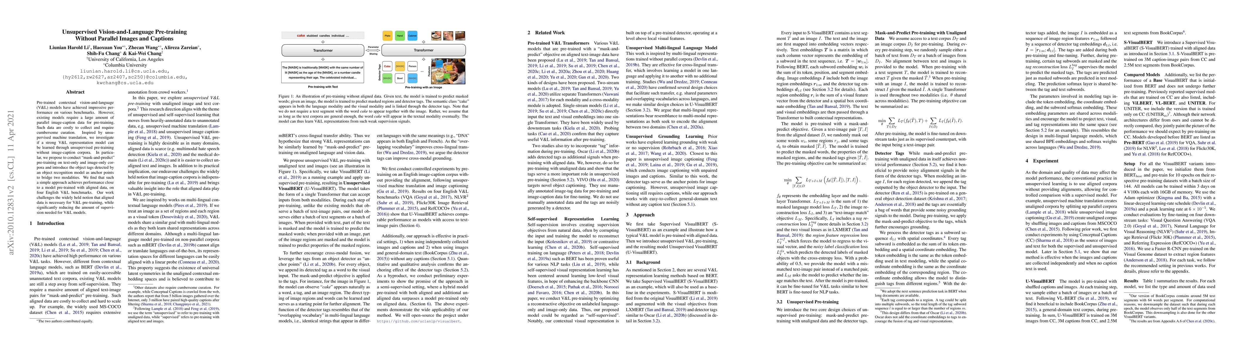 This paper proposes an unsupervised pre-training method for vision-and-language models that does not require parallel image-caption data, instead using "mask-and-predict" on text-only and image-only corpora with object tags as anchors. The approach achieves performance comparable to models trained with aligned data, challenging the necessity of aligned data for V&L pre-training.