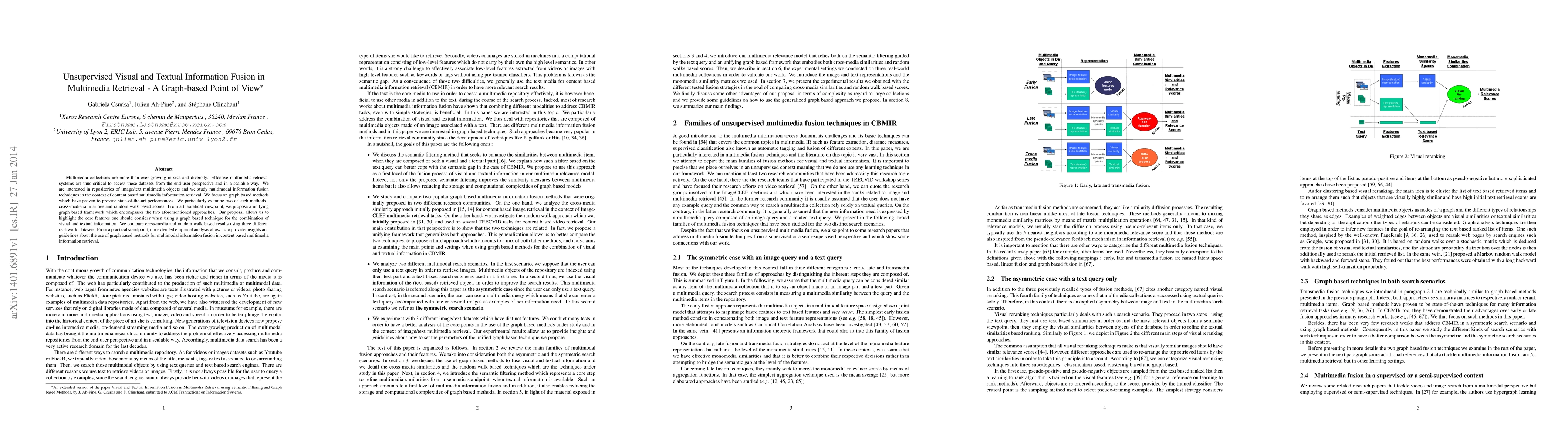 This research proposes a graph-based framework for fusing visual and textual information in content-based multimedia retrieval, focusing on cross-media similarities and random walk scores. The study provides practical insights and guidelines for effective multimodal information fusion using graph techniques.