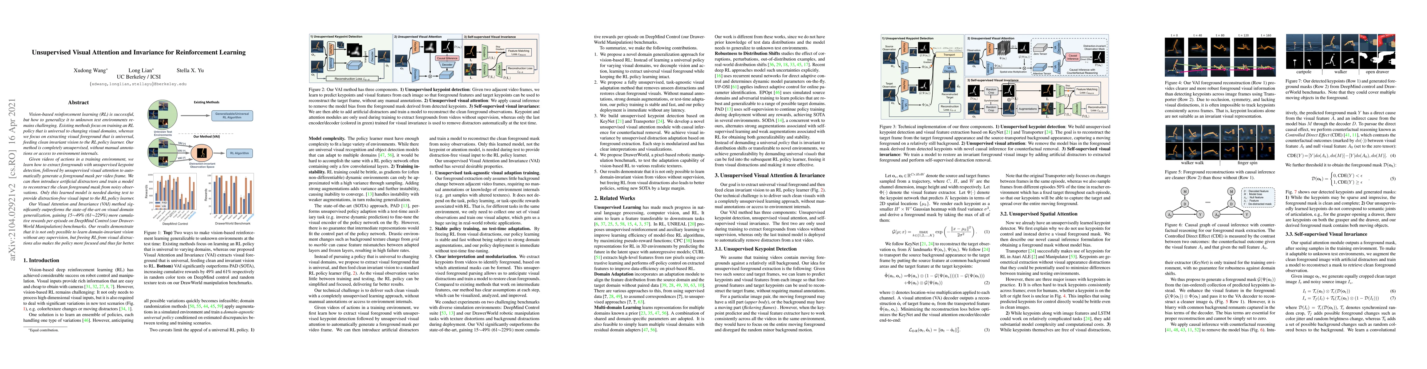 Vision-based reinforcement learning (RL) is successful, but how to generalize it to unknown test environments remains challenging. Existing methods focus on training an RL policy that is universal to changing visual domains, whereas we focus on extracting visual foreground that is universal, feeding clean invariant vision to the RL policy learner. Our method is completely unsupervised, without manual annotations or access to environment internals. Given videos of actions in a training environment, we learn how to extract foregrounds with unsupervised keypoint detection, followed by unsupervised visual attention to automatically generate a foreground mask per video frame. We can then introduce artificial distractors and train a model to reconstruct the clean foreground mask from noisy observations. Only this learned model is needed during test to provide distraction-free visual input to the RL policy learner. Our Visual Attention and Invariance (VAI) method significantly outperforms the state-of-the-art on visual domain generalization, gaining 15 to 49% (61 to 229%) more cumulative rewards per episode on DeepMind Control (our DrawerWorld Manipulation) benchmarks. Our results demonstrate that it is not only possible to learn domain-invariant vision without any supervision, but freeing RL from visual distractions also makes the policy more focused and thus far better.