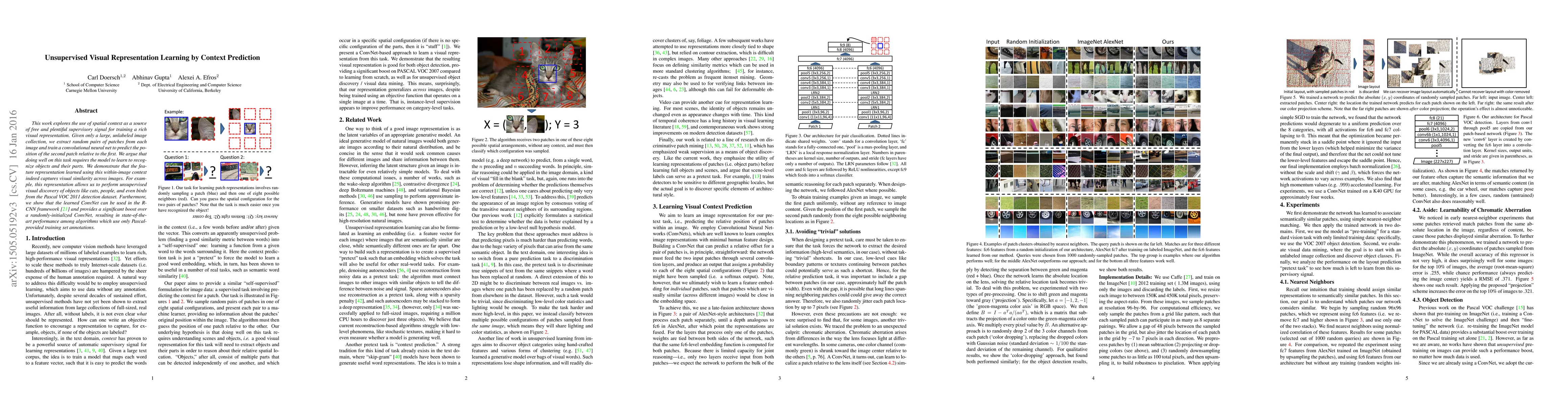 This work explores the use of spatial context as a source of free and plentiful supervisory signal for training a rich visual representation. Given only a large, unlabeled image collection, we extract random pairs of patches from each image and train a convolutional neural net to predict the position of the second patch relative to the first. We argue that doing well on this task requires the model to learn to recognize objects and their parts. We demonstrate that the feature representation learned using this within-image context indeed captures visual similarity across images. For example, this representation allows us to perform unsupervised visual discovery of objects like cats, people, and even birds from the Pascal VOC 2011 detection dataset. Furthermore, we show that the learned ConvNet can be used in the R-CNN framework and provides a significant boost over a randomly-initialized ConvNet, resulting in state-of-the-art performance among algorithms which use only Pascal-provided training set annotations.