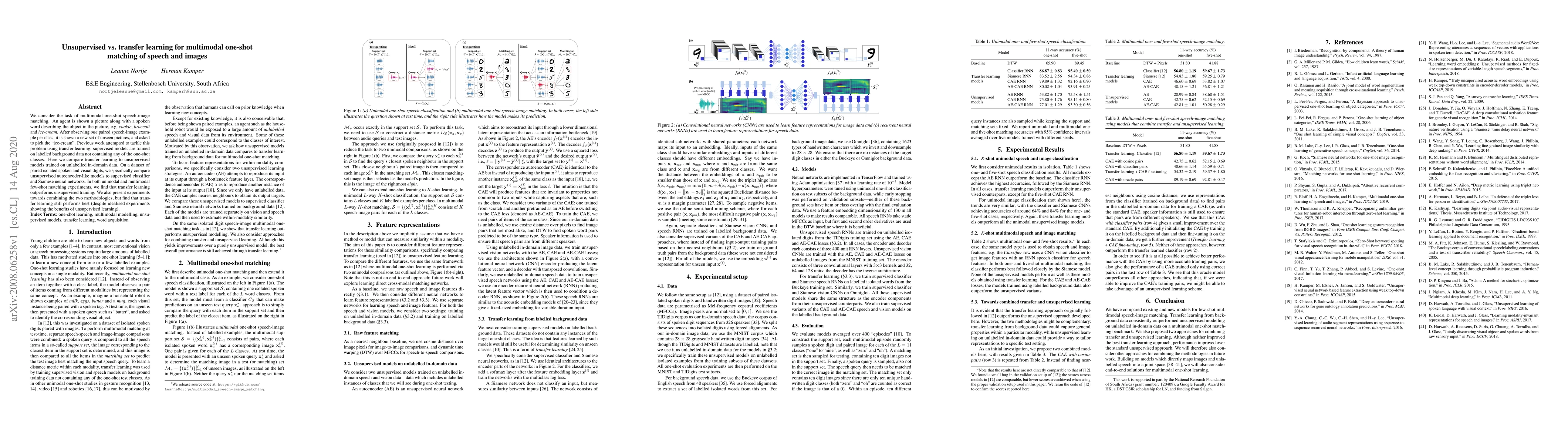 This paper compares transfer learning and unsupervised learning for one-shot speech-image matching, finding that transfer learning outperforms unsupervised methods despite experiments showing the potential benefits of the latter. The study uses paired spoken and visual digits to evaluate autoencoder-like models against supervised classifiers and Siamese networks.