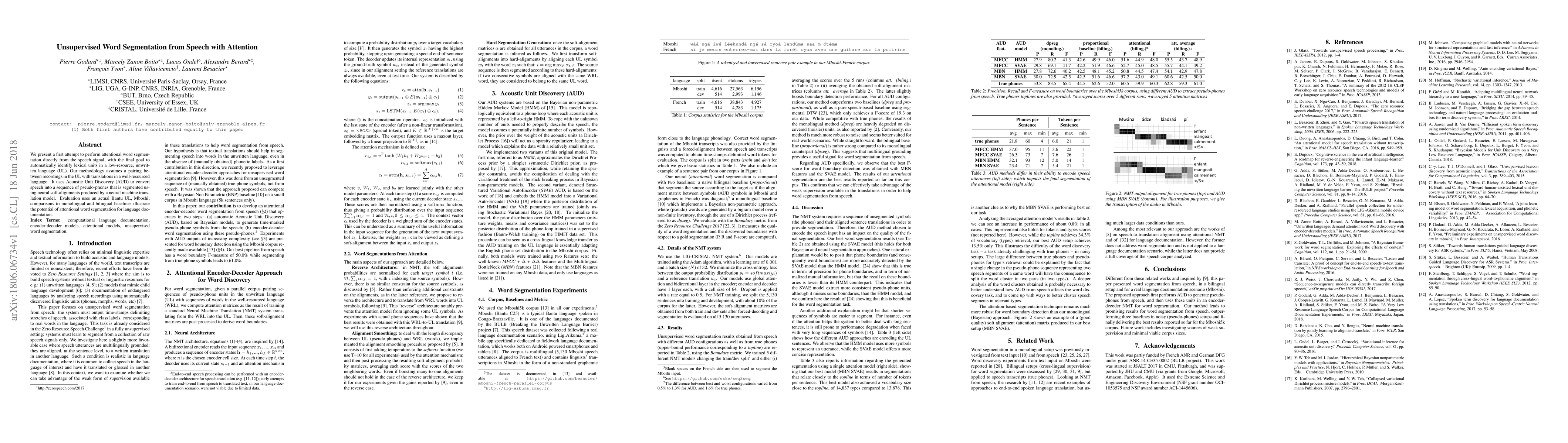 This paper explores unsupervised word segmentation from speech using attentional techniques, aiming to identify lexical units in low-resource, unwritten languages. It employs Acoustic Unit Discovery and neural soft-alignments from a machine translation model, demonstrating its effectiveness with the Mboshi Bantu language.