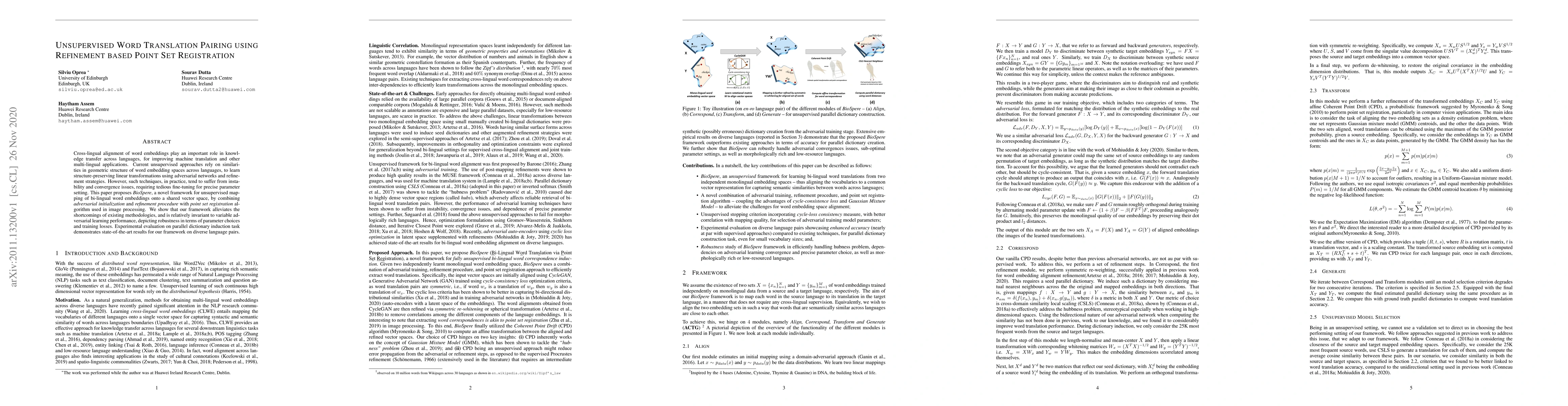 This paper introduces BioSpere, a novel framework for unsupervised word translation pairing that combines adversarial initialization and refinement with point set registration, achieving robust cross-lingual alignment of word embeddings and demonstrating state-of-the-art performance on parallel dictionary induction tasks. The method addresses instability and convergence issues of existing techniques, showing improved robustness and parameter invariance.