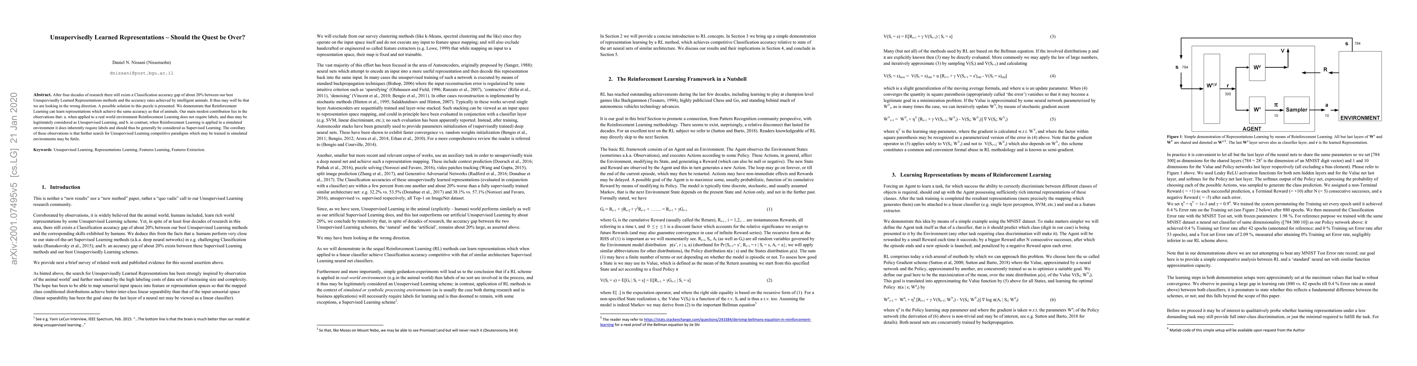 There exists a Classification accuracy gap of about 20% between our best methods of generating Unsupervisedly Learned Representations and the accuracy rates achieved by (naturally Unsupervisedly Learning) humans. We are at our fourth decade at least in search of this class of paradigms. It thus may well be that we are looking in the wrong direction. We present in this paper a possible solution to this puzzle. We demonstrate that Reinforcement Learning schemes can learn representations, which may be used for Pattern Recognition tasks such as Classification, achieving practically the same accuracy as that of humans. Our main modest contribution lies in the observations that: a. when applied to a real world environment (e.g. nature itself) Reinforcement Learning does not require labels, and thus may be considered a natural candidate for the long sought, accuracy competitive Unsupervised Learning method, and b. in contrast, when Reinforcement Learning is applied in a simulated or symbolic processing environment (e.g. a computer program) it does inherently require labels and should thus be generally classified, with some exceptions, as Supervised Learning. The corollary of these observations is that further search for Unsupervised Learning competitive paradigms which may be trained in simulated environments like many of those found in research and applications may be futile.