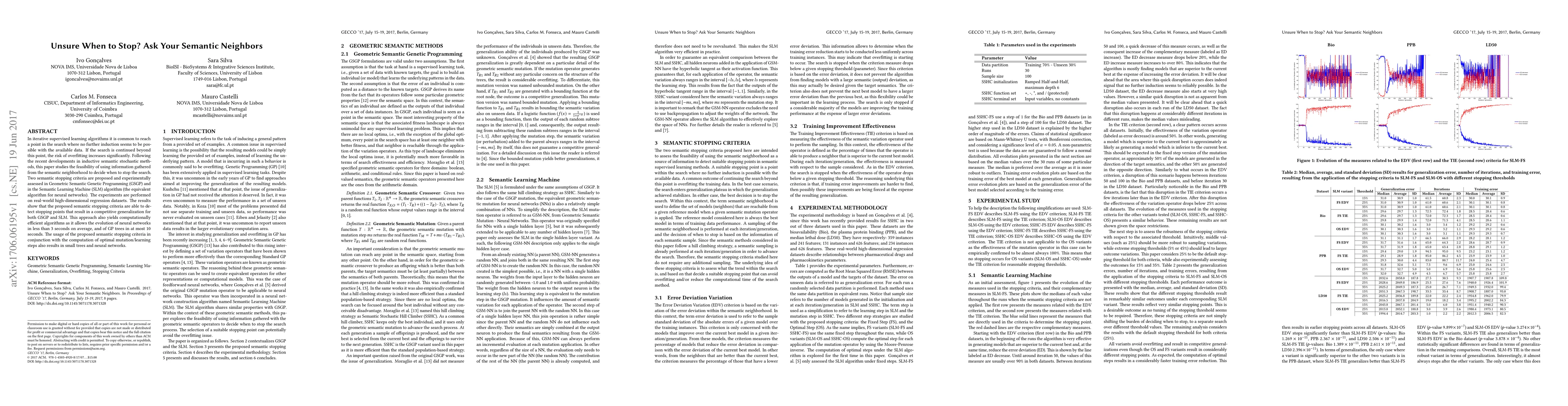 In iterative supervised learning algorithms it is common to reach a point in the search where no further induction seems to be possible with the available data. If the search is continued beyond this point, the risk of overfitting increases significantly. Following the recent developments in inductive semantic stochastic methods, this paper studies the feasibility of using information gathered from the semantic neighborhood to decide when to stop the search. Two semantic stopping criteria are proposed and experimentally assessed in Geometric Semantic Genetic Programming (GSGP) and in the Semantic Learning Machine (SLM) algorithm (the equivalent algorithm for neural networks). The experiments are performed on real-world high-dimensional regression datasets. The results show that the proposed semantic stopping criteria are able to detect stopping points that result in a competitive generalization for both GSGP and SLM. This approach also yields computationally efficient algorithms as it allows the evolution of neural networks in less than 3 seconds on average, and of GP trees in at most 10 seconds. The usage of the proposed semantic stopping criteria in conjunction with the computation of optimal mutation/learning steps also results in small trees and neural networks.