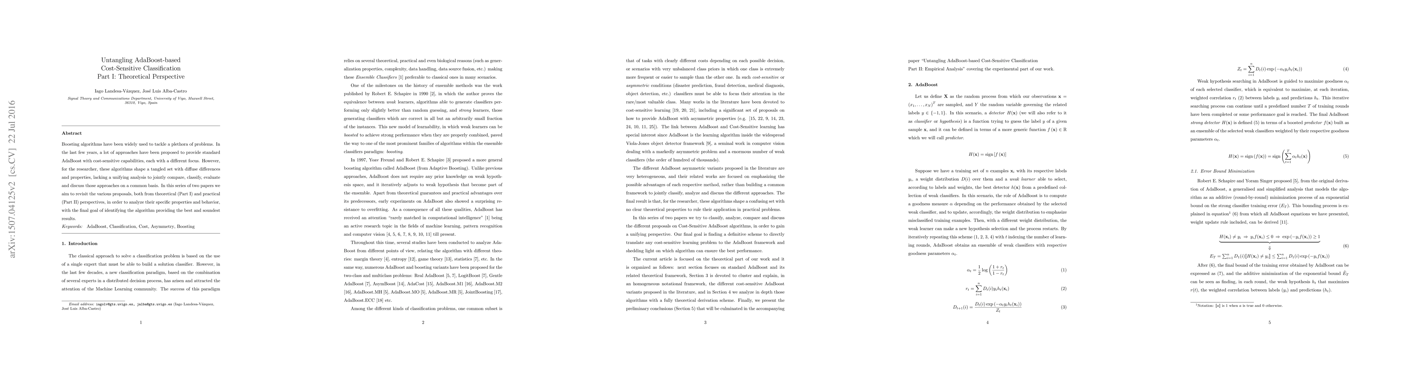 Boosting algorithms have been widely used to tackle a plethora of problems. In the last few years, a lot of approaches have been proposed to provide standard AdaBoost with cost-sensitive capabilities, each with a different focus. However, for the researcher, these algorithms shape a tangled set with diffuse differences and properties, lacking a unifying analysis to jointly compare, classify, evaluate and discuss those approaches on a common basis. In this series of two papers we aim to revisit the various proposals, both from theoretical (Part I) and practical (Part II) perspectives, in order to analyze their specific properties and behavior, with the final goal of identifying the algorithm providing the best and soundest results.