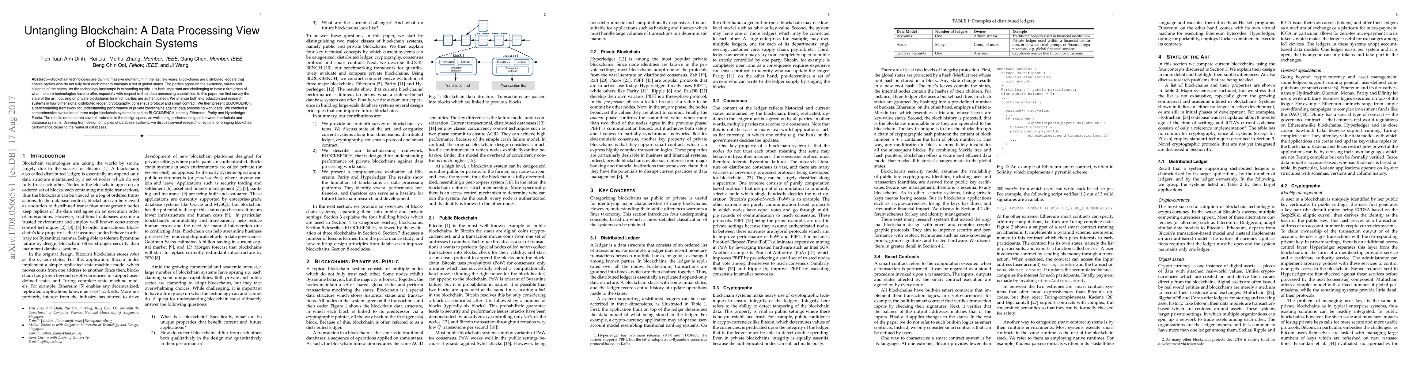 This paper surveys private blockchain technologies, analyzing their data processing capabilities across four dimensions: distributed ledger, cryptography, consensus protocol, and smart contracts. It introduces BLOCKBENCH to benchmark private blockchain performance, revealing significant performance gaps compared to traditional databases and suggesting research directions for improving blockchain efficiency.