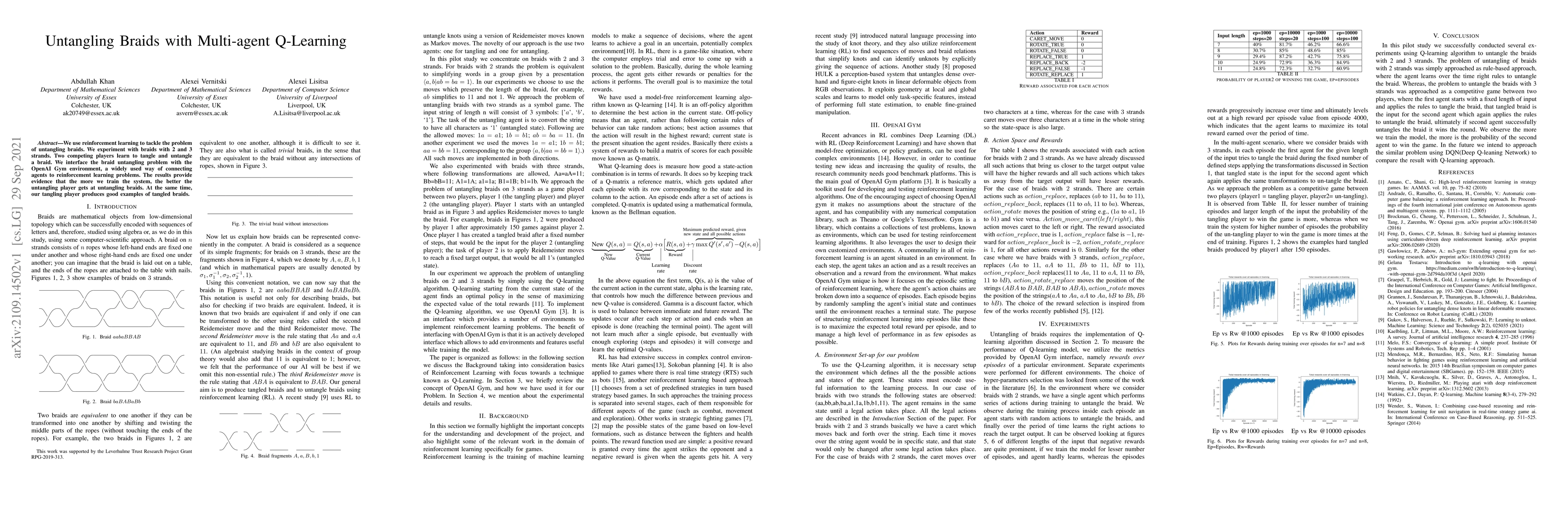 This research applies multi-agent reinforcement learning to solve the problem of untangling braids, using two players to tangle and untangle braids within an environment modeled by the OpenAI Gym. The study demonstrates that with increased training, the untangling player becomes more proficient, while the tangling player generates useful examples of complex braids.