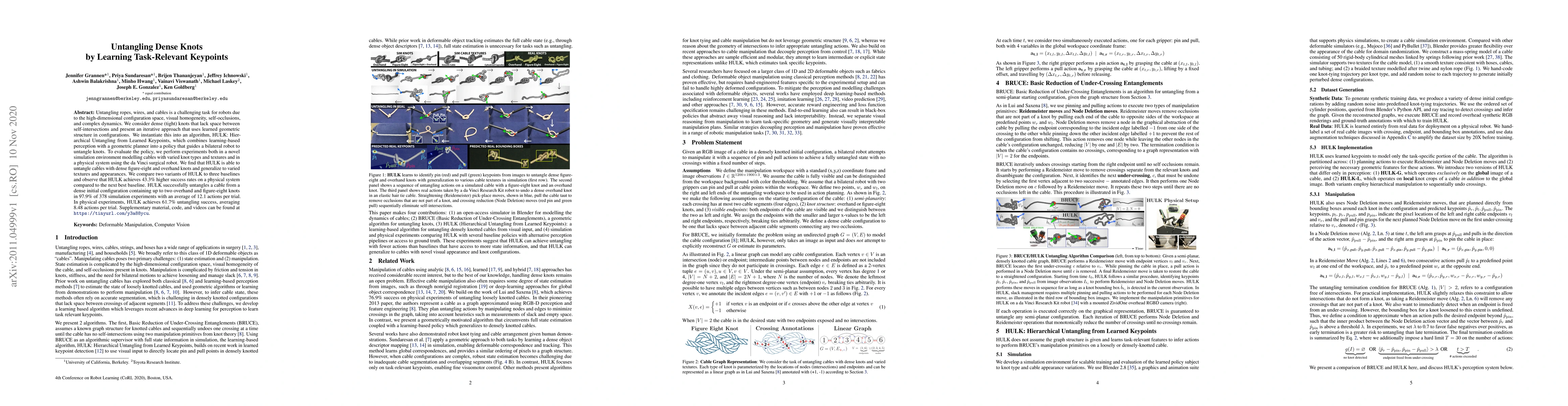 This paper proposes HULK, an algorithm that uses learned keypoints and hierarchical planning to untangle dense knots in ropes and cables. Experiments show HULK achieves significantly higher success rates compared to baselines in both simulated and physical environments, effectively handling complex knots and varying textures.
