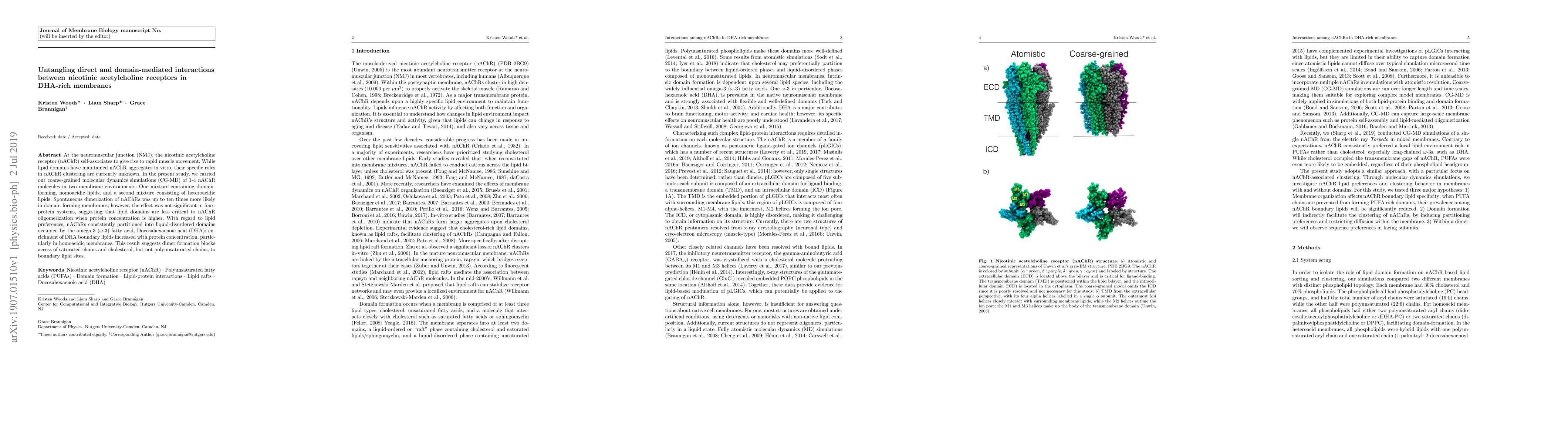 This study uses coarse-grained molecular dynamics simulations to investigate the role of lipid domains in nicotinic acetylcholine receptor (nAChR) clustering, finding that domain-forming lipids enhance nAChR dimerization, though this effect diminishes with higher protein concentrations. The study also reveals that nAChRs preferentially partition into liquid-disordered domains enriched with DHA, indicating a complex interaction between receptor oligomerization and lipid composition.