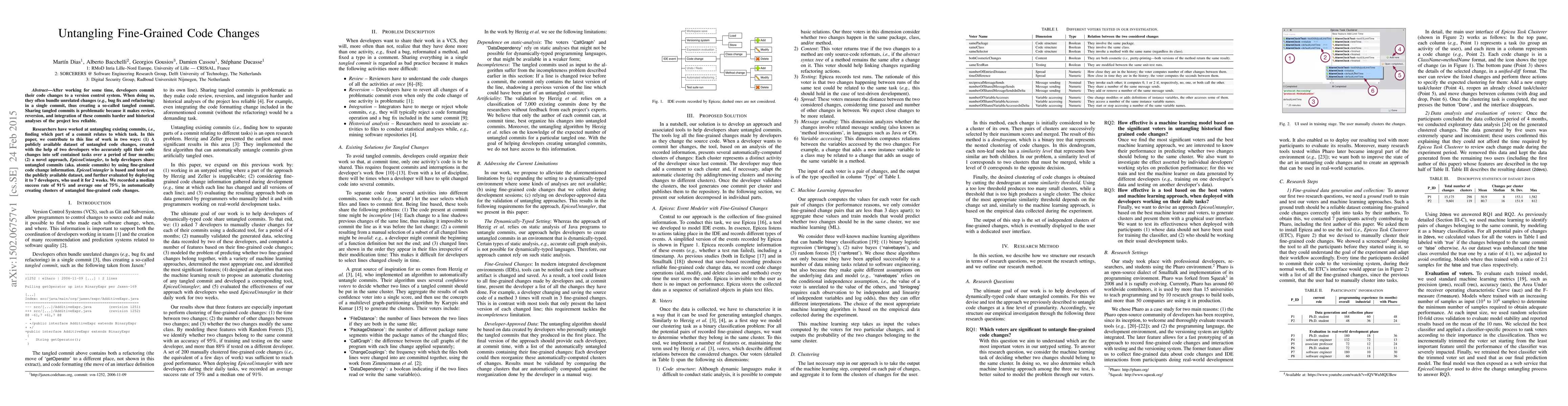 This paper presents a dataset of untangled code changes from developers and introduces EpiceaUntangler, a novel approach to help developers create atomic commits. The method was tested on the dataset and deployed by 7 developers, achieving a median success rate of 91% in clustering fine-grained code changes.