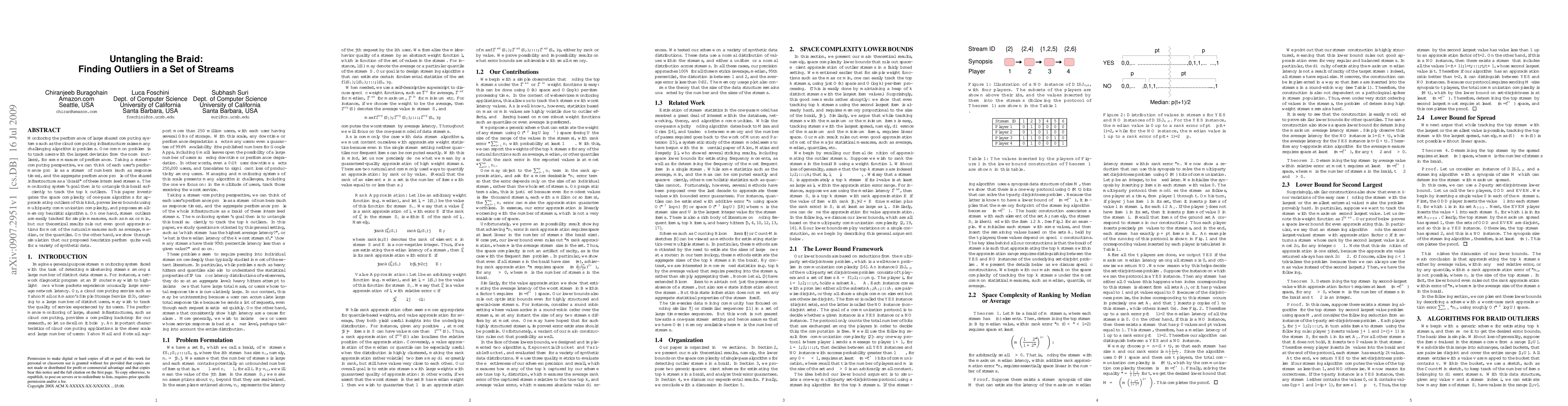 Monitoring the performance of large shared computing systems such as the cloud computing infrastructure raises many challenging algorithmic problems. One common problem is to track users with the largest deviation from the norm (outliers), for some measure of performance. Taking a stream-computing perspective, we can think of each user's performance profile as a stream of numbers (such as response times), and the aggregate performance profile of the shared infrastructure as a "braid" of these intermixed streams. The monitoring system's goal then is to untangle this braid sufficiently to track the top k outliers. This paper investigates the space complexity of one-pass algorithms for approximating outliers of this kind, proves lower bounds using multi-party communication complexity, and proposes small-memory heuristic algorithms. On one hand, stream outliers are easily tracked for simple measures, such as max or min, but our theoretical results rule out even good approximations for most of the natural measures such as average, median, or the quantiles. On the other hand, we show through simulation that our proposed heuristics perform quite well for a variety of synthetic data.