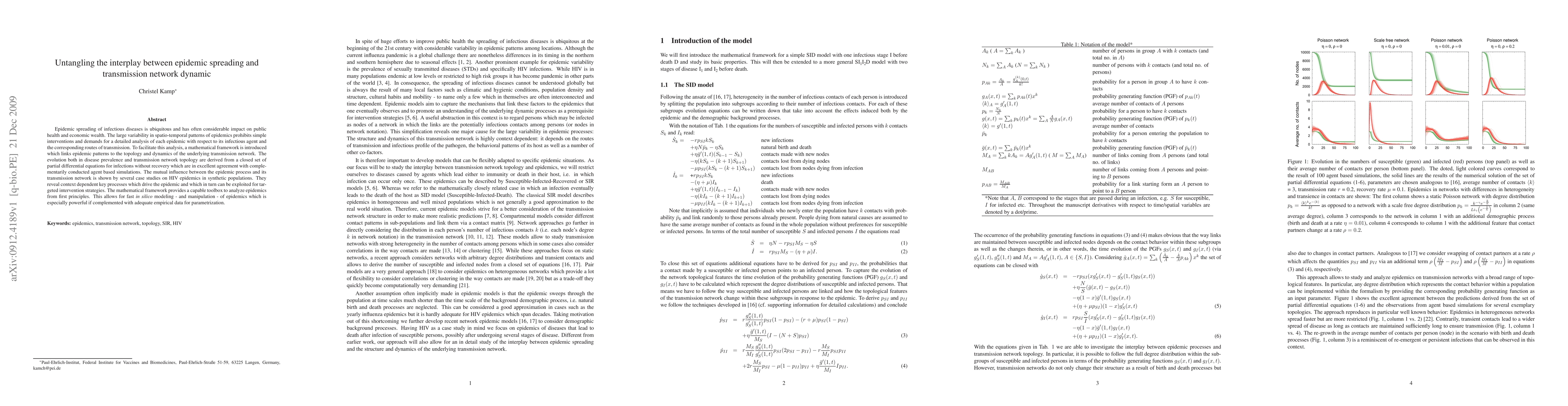 Epidemic spreading of infectious diseases is ubiquitous and has often considerable impact on public health and economic wealth. The large variability in spatio-temporal patterns of epidemics prohibits simple interventions and demands for a detailed analysis of each epidemic with respect to its infectious agent and the corresponding routes of transmission. To facilitate this analysis, a mathematical framework is introduced which links epidemic patterns to the topology and dynamics of the underlying transmission network. The evolution both in disease prevalence and transmission network topology are derived from a closed set of partial differential equations for infections without recovery which are in excellent agreement with complementarily conducted agent based simulations. The mutual influence between the epidemic process and its transmission network is shown by several case studies on HIV epidemics in synthetic populations. They reveal context dependent key processes which drive the epidemic and which in turn can be exploited for targeted intervention strategies. The mathematical framework provides a capable toolbox to analyze epidemics from first principles. This allows for fast in silico modeling - and manipulation - of epidemics which is especially powerful if complemented with adequate empirical data for parametrization.