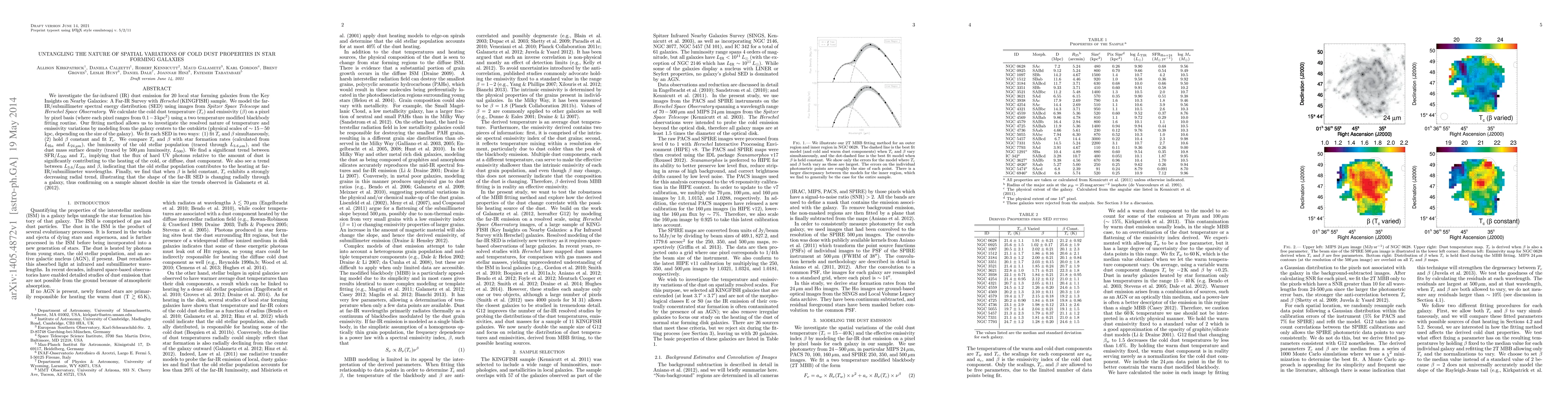 We investigate the far-infrared (IR) dust emission for 20 local star forming galaxies from the Key Insights on Nearby Galaxies: A Far-IR Survey with Herschel (KINGFISH) sample. We model the far-IR/submillimeter spectral energy distribution (SED) using images from Spitzer Space Telescope and Herschel Space Observatory. We calculate the cold dust temperature (T(cold)) and emissivity (beta) on a pixel by pixel basis (where each pixel ranges from 0.1-3 kpc^2) using a two temperature modified blackbody fitting routine. Our fitting method allows us to investigate the resolved nature of temperature and emissivity variations by modeling from the galaxy centers to the outskirts (physical scales of ~15-50 kpc, depending on the size of the galaxy). We fit each SED in two ways: (1) fit T(cold) and beta simultaneously, (2) hold beta constant and fit T(cold). We compare T(cold) and beta with star formation rates (calculated from L(Halpha) and L(24)), the luminosity of the old stellar population (traced through L(3.6), and the dust mass surface density (traced by 500 micron luminosity, L(500)). We find a significant trend between SFR/L(500) and T(cold), implying that the flux of hard UV photons relative to the amount of dust is significantly contributing to the heating of the cold, or diffuse, dust component. We also see a trend between L(3.6)/L(500) and beta, indicating that the old stellar population contributes to the heating at far-IR/submillimeter wavelengths. Finally, we find that when beta is held constant, T(cold) exhibits a strongly decreasing radial trend, illustrating that the shape of the far-IR SED is changing radially through a galaxy, thus confirming on a sample almost double in size the trends observed in Galametz et al. (2012).