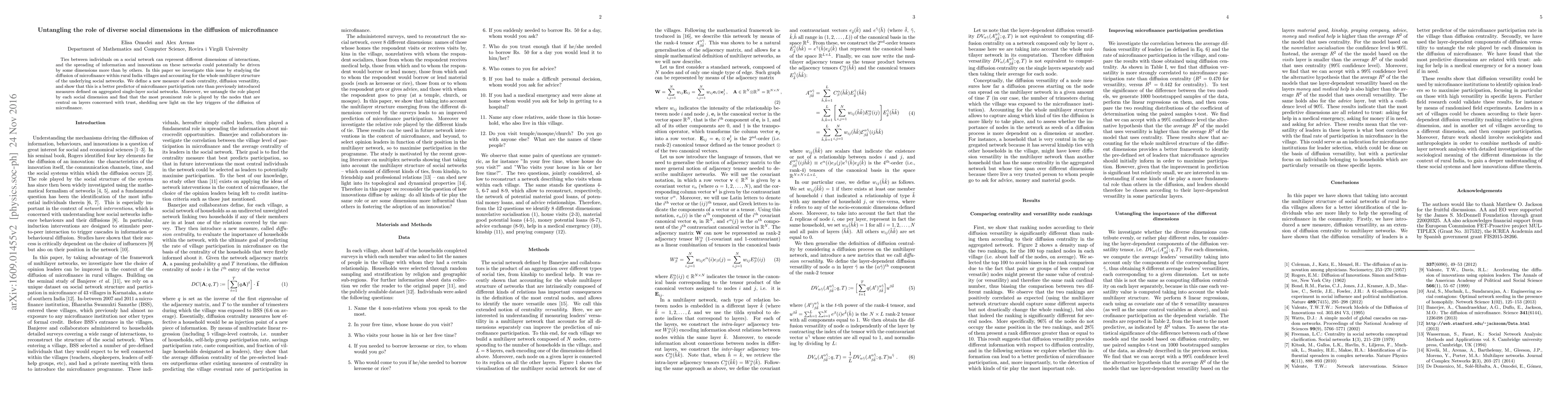 Ties between individuals on a social network can represent different dimensions of interactions, and the spreading of information and innovations on these networks could potentially be driven by some dimensions more than by others. In this paper we investigate this issue by studying the diffusion of microfinance within rural India villages and accounting for the whole multilayer structure of the underlying social networks. We define a new measure of node centrality, diffusion versatility, and show that this is a better predictor of microfinance participation rate than previously introduced measures defined on aggregated single-layer social networks. Moreover, we untangle the role played by each social dimension and find that the most prominent role is played by the nodes that are central on layers concerned with trust, shedding new light on the key triggers of the diffusion of microfinance.