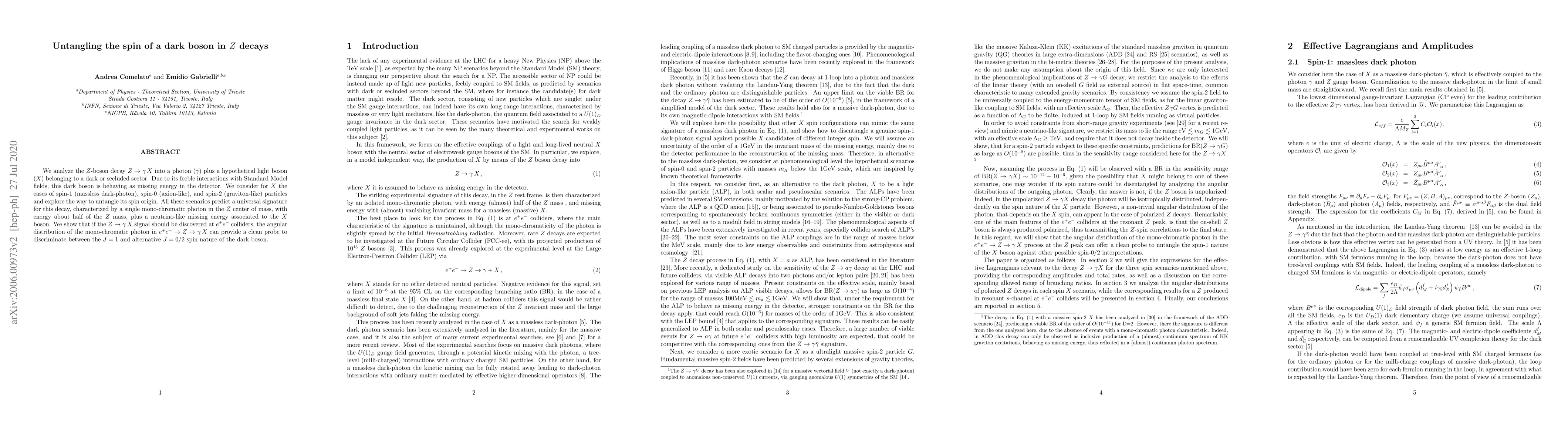 We analyze the $Z$-boson decay $Z\to \gamma\, X$ into a photon ($\gamma$) plus a hypothetical light boson ($X$) belonging to a dark or secluded sector. Due to its feeble interactions with Standard Model fields, this dark boson is behaving as missing energy in the detector. We consider for $X$ the cases of spin-1 (massless dark-photon), spin-0 (axion-like), and spin-2 (graviton-like) particles and explore the way to untangle its spin origin. All these scenarios predict a universal signature for this decay, characterized by a single mono-chromatic photon in the $Z$ center of mass, with energy about half of the $Z$ mass, plus a neutrino-like missing energy associated to the $X$ boson. We show that if the $Z\to \gamma\, X$ signal should be discovered at $e^+e^-$ colliders, the angular distribution of the mono-chromatic photon in $e^+e^-\to Z\to \gamma\, X$ can provide a clean probe to discriminate between the $J=1$ and alternative $J=0/2$ spin nature of the $X$ dark boson.