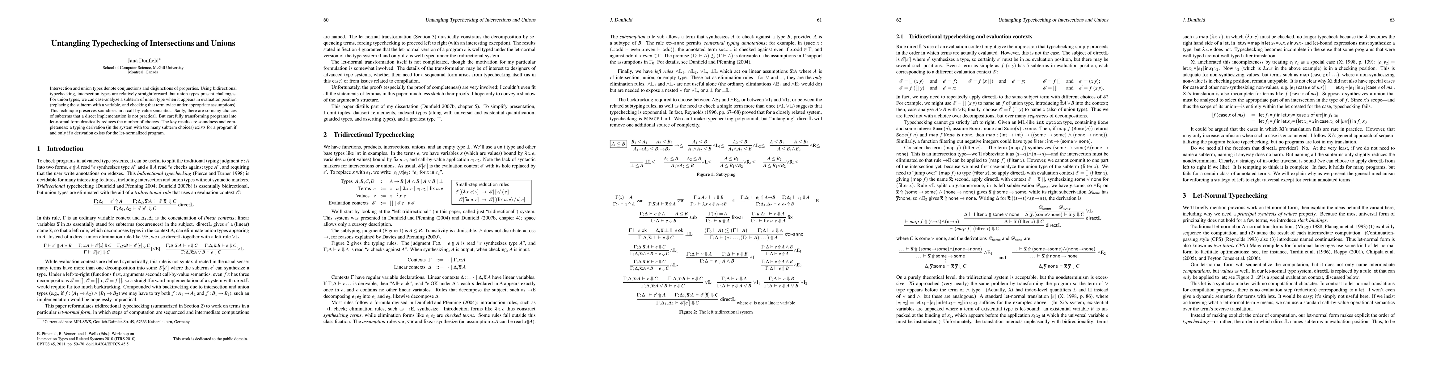 Intersection and union types denote conjunctions and disjunctions of properties. Using bidirectional typechecking, intersection types are relatively straightforward, but union types present challenges. For union types, we can case-analyze a subterm of union type when it appears in evaluation position (replacing the subterm with a variable, and checking that term twice under appropriate assumptions). This technique preserves soundness in a call-by-value semantics. Sadly, there are so many choices of subterms that a direct implementation is not practical. But carefully transforming programs into let-normal form drastically reduces the number of choices. The key results are soundness and completeness: a typing derivation (in the system with too many subterm choices) exists for a program if and only if a derivation exists for the let-normalized program.